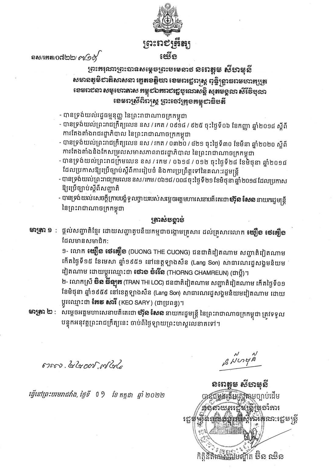 ក្រុមគ្រួសាររបស់ឧញ៉ា ថោង សារ៉ាត់ ដែលធ្លាប់ត្រូវបានតុលាការផ្តន្ទាទោសជាមួយអង្គរក្សរបស់ខ្លួនដាក់ពន្ធនាគារអស់មួយជីវិត កាលពីឆ្នាំ២០១៩នោះ ត្រូវបានព្រះមហាក្សត្រចេញព្រះរាជក្រឹត្យត្រាស់បង្គាប់ផ្តល់សញ្ជាតិខ្មែរ។