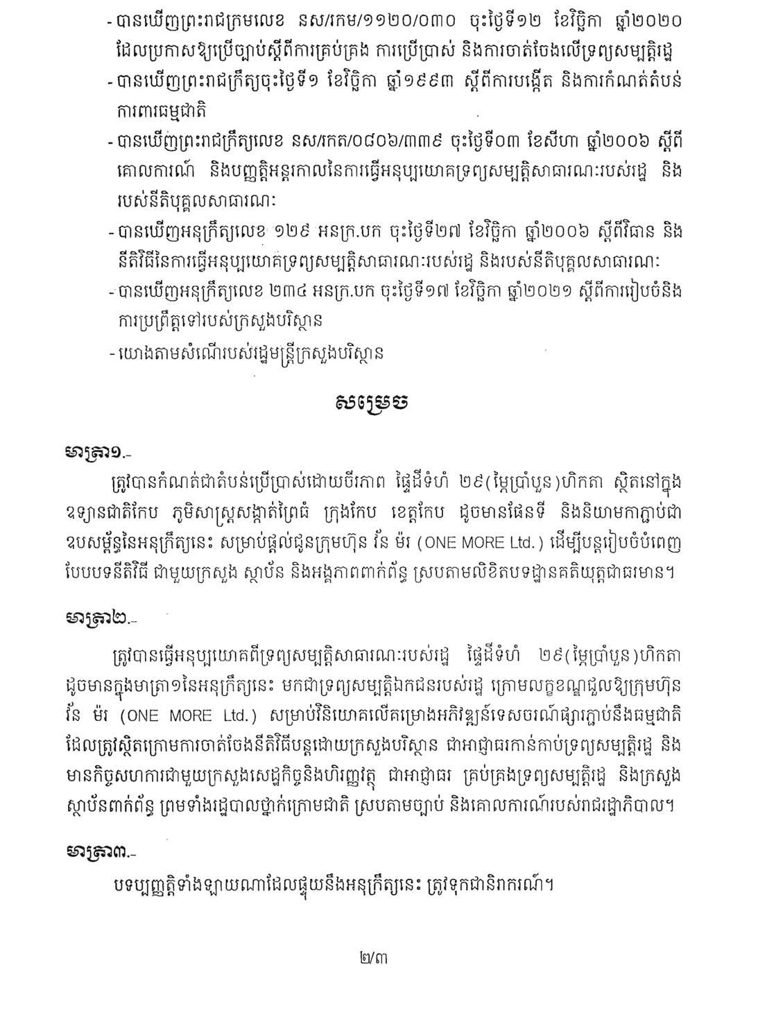 យោងតាមអនុក្រឹត្យលេខ២៤២អនក្រ.បក ចុះថ្ងៃទី២៥ ខែវិច្ឆិកា ឆ្នាំ២០២២ (សៀវភៅរាជកិច្ចលេខ៦៨ ទំព័រ ៨៣៤៧) និងចេញផ្សាយនៅលើគេហទំព័ររបស់ទីស្តីការគណៈរដ្ឋមន្ត្រី កាលពីថ្ងៃទី២៤ ខែមេសា ឆ្នាំ២០២៣ លោកនាយករដ្ឋមន្ត្រី ហ៊ុន សែន បានសម្រេចធ្វើអនុប្បយោគពីទ្រព្យសម្បត្តិសាធារណៈរបស់រដ្ឋ លើផ្ទៃដីទំហំ ២៩ហិកតា ស្ថិតក្នុងភូមិសាស្ត្រសង្កាត់ព្រៃធំ ក្រុងកែប ខេត្តកែប មកជាទ្រព្យសម្បត្តិឯកជនរបស់រដ្ឋ ក្រោមលក្ខខណ្ឌជួលឱ្យក្រុមហ៊ុន វ័ន ម៉រ (One More Ltd.) សម្រាប់វិនិយោគលើគម្រោងអភិវឌ្ឍន៍ទេសចរណ៍ផ្សារភ្ជាប់នឹងធម្មជាតិ។