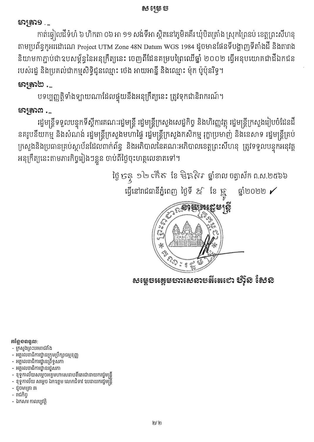 យោងតាមអនុក្រឹត្យលេខ២៥៤ អនក្រ.បក របស់រដ្ឋាភិបាល ចុះថ្ងៃទី៥ ខែធ្នូ ឆ្នាំ២០២២ (សៀវភៅរាជកិច្ចលេខ៧១ ទំព័រ ៨៧២៣) និងបានចេញផ្សាយនៅលើគេហទំព័ររបស់ទីស្តីការគណៈរដ្ឋមន្ត្រី កាលពីថ្ងៃទី២៨ ខែមេសា ឆ្នាំ២០២៣ រដ្ឋាភិបាលបានសម្រេចកាត់ឆ្វៀលដីទំហំ ៦ហិកតា ៦អា ១១សង់ទីអា ស្ថិតនៅភូមិគគីរ ឃុំបិតត្រាំង ស្រុកព្រៃនប់ ខេត្តព្រះសីហនុ ចេញពីដែនគម្របព្រៃឈើឆ្នាំ២០២២ ធ្វើអនុប្បជាដីឯកជនរបស់រដ្ឋ និងប្រគល់ជាកម្មសិទ្ធិទៅឱ្យឈ្មោះ ថេង អាយអាន្នី និងឈ្មោះ ម៉ុក ប៉ូប៉ុនរិទ្ធ។