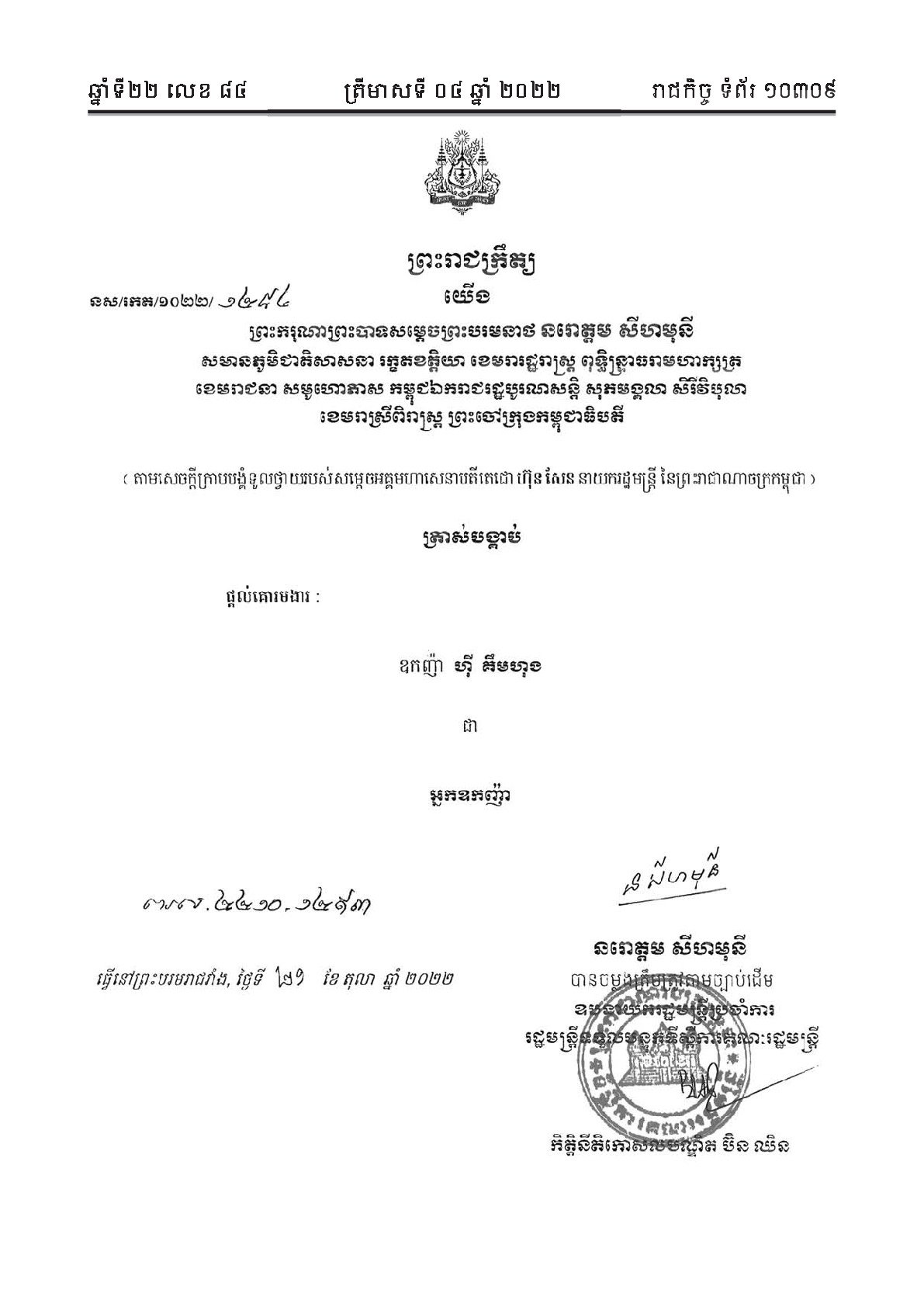 ក្នុងព្រះរាជក្រឹត្យចុះថ្ងៃទី២១ ខែតុលា ឆ្នាំ២០២២ ព្រះករុណាព្រះបាទសម្ដេចព្រះបរមនាថ នរោត្ដសីហមុនី បានត្រាស់បង្គាប់ផ្ដល់គោរមងារដល់លោក ហ៊ី គឹមហុង ជាអ្នកឧកញ៉ា ចាប់ពីថ្ងៃឡាយព្រះហស្តលេខានេះតទៅ។ នេះបើតាមសៀវរាជកិច្ចលេខ ៨៤ ទំព័រ ១០៣០៩ ដែលចេញដោយទីស្ដីការគណៈរដ្ឋមន្ត្រីកាលពីឆ្នាំ២០២២។