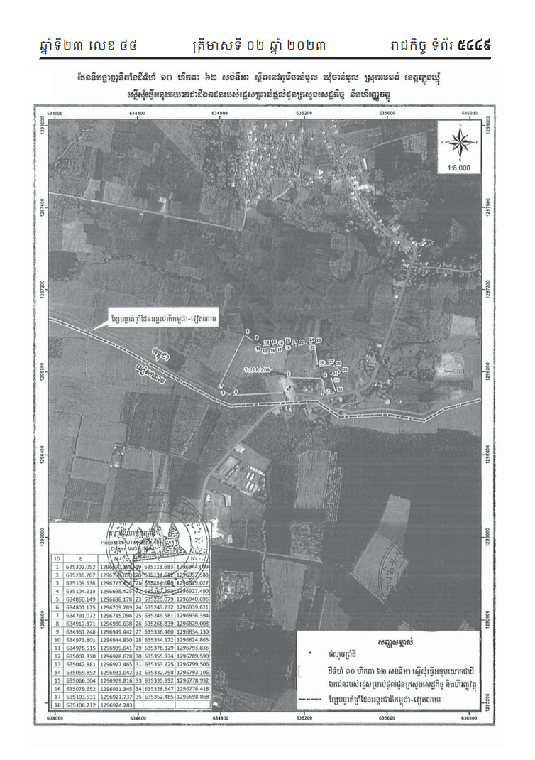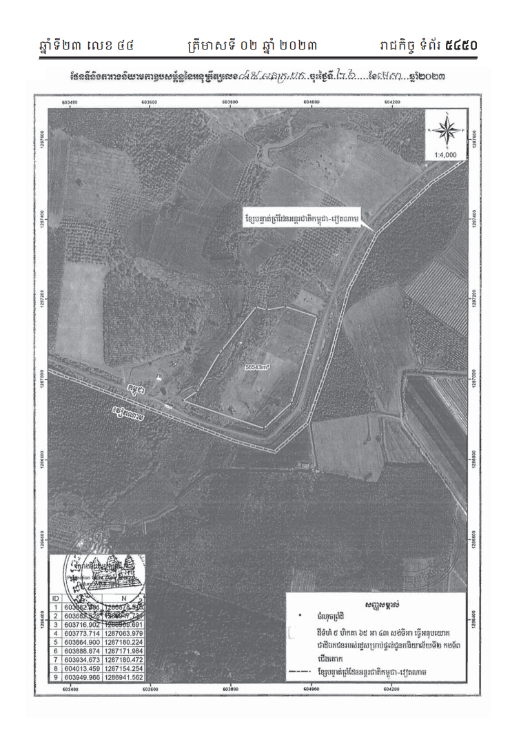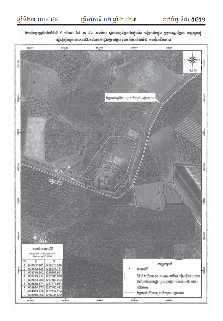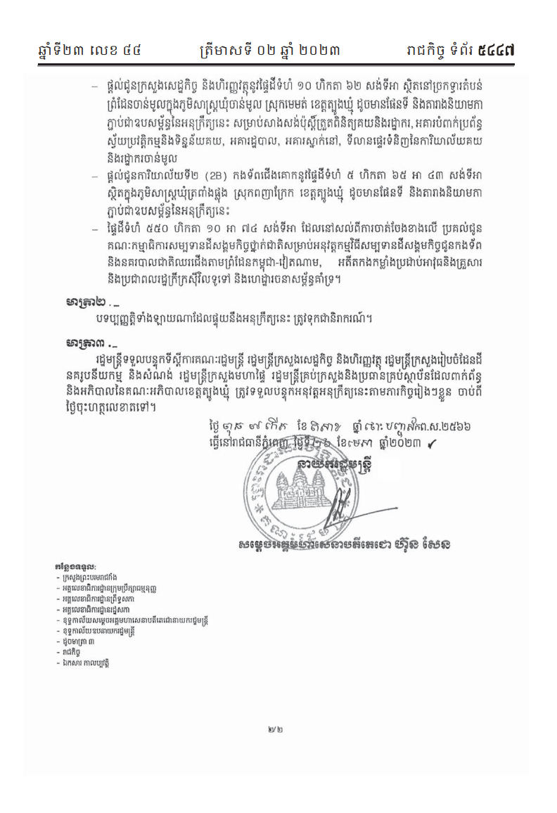 រដ្ឋាភិបាលធ្វើអនុប្បយោគដីសាធារណៈរបស់រដ្ឋទំហំ ៥៦៥ ហិកតា ៧៦អា ៧៩ សង់ទីអា ស្ថិតក្នុងភូមិសាស្រ្ត ស្រុកមេមត់ និងស្រុកពញាក្រែក ខេត្តត្បូងឃ្មុំ ជាដីឯកជនរបស់រដ្ឋ ផ្តល់ជូនក្រ សួងសេដ្ឋកិច្ច និងហិរញ្ញវត្ថុ កងទ័ពជើងគោក និងគណៈកម្មាធិការសម្បទានដីសង្គមកិច្ចថ្នាក់ជាតិ។