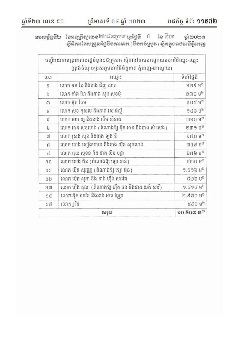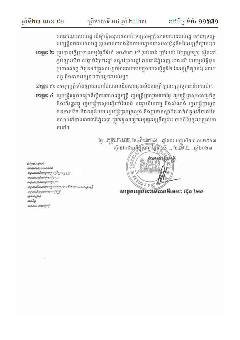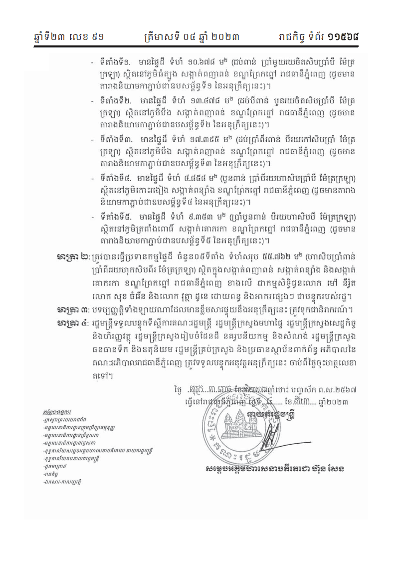 ចំណែកឯកសារមួយទៀតដែលចុះកាលបរិច្ឆេទថ្ងៃតែមួយ រដ្ឋាភិបាលបានកាត់ឆ្វៀលផ្ទៃដីចំនួន ១០.៥០៣ ម៉ែត្រក្រឡា ស្ថិតនៅភូមិផ្សារលិច សង្កាត់ព្រែកព្នៅ ខណ្ឌព្រែកព្នៅ រាជធា នីភ្នំពេញ ដើម្បីធ្វើអនុបយោគពីទ្រព្យសម្បត្តិសាធារណៈរបស់ រដ្ឋទៅជាទ្រព្យសម្បត្តិឯកជនរបស់រដ្ឋ ឱ្យទៅប្រជាពលរដ្ឋនិង ធ្វើប្រទានកម្មជាកម្មសិទ្ធិ ជូនប្រ ជាពលរដ្ឋចំនួន១៥គ្រួសារ ដោយពន្ធ និងអាករផ្សេងៗជាបន្ទុករបស់រដ្ឋ។