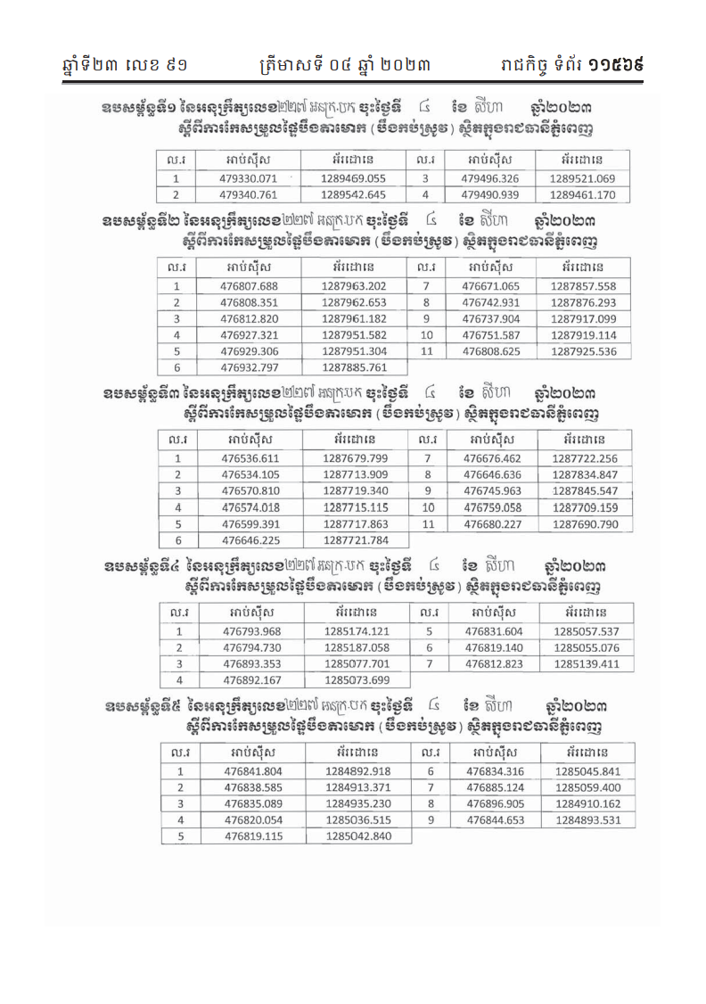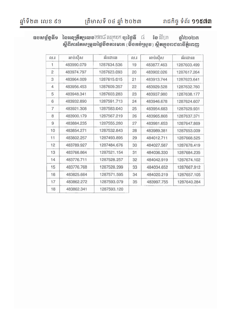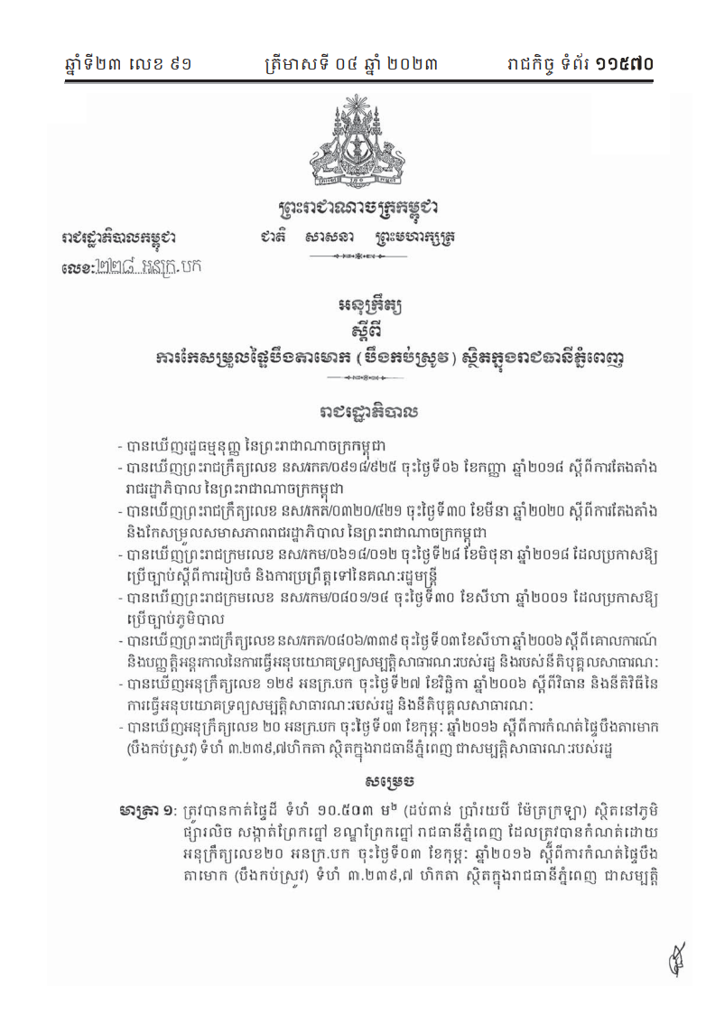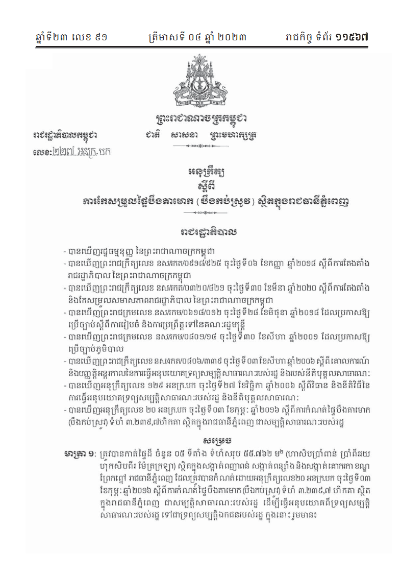 ចំណែកឯកសារមួយទៀតដែលចុះកាលបរិច្ឆេទថ្ងៃតែមួយ រដ្ឋាភិបាលបានកាត់ឆ្វៀលផ្ទៃដីចំនួន ១០.៥០៣ ម៉ែត្រក្រឡា ស្ថិតនៅភូមិផ្សារលិច សង្កាត់ព្រែកព្នៅ ខណ្ឌព្រែកព្នៅ រាជធា នីភ្នំពេញ ដើម្បីធ្វើអនុបយោគពីទ្រព្យសម្បត្តិសាធារណៈរបស់ រដ្ឋទៅជាទ្រព្យសម្បត្តិឯកជនរបស់រដ្ឋ ឱ្យទៅប្រជាពលរដ្ឋនិង ធ្វើប្រទានកម្មជាកម្មសិទ្ធិ ជូនប្រ ជាពលរដ្ឋចំនួន១៥គ្រួសារ ដោយពន្ធ និងអាករផ្សេងៗជាបន្ទុករបស់រដ្ឋ។