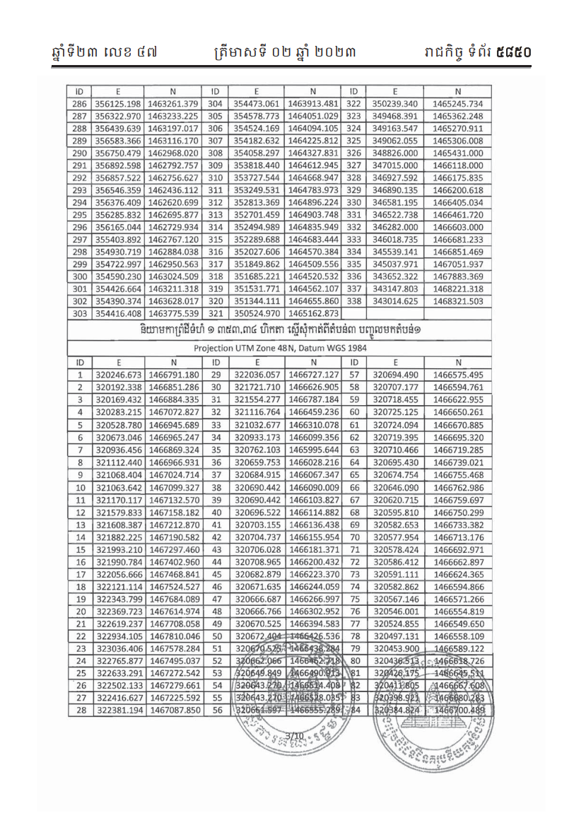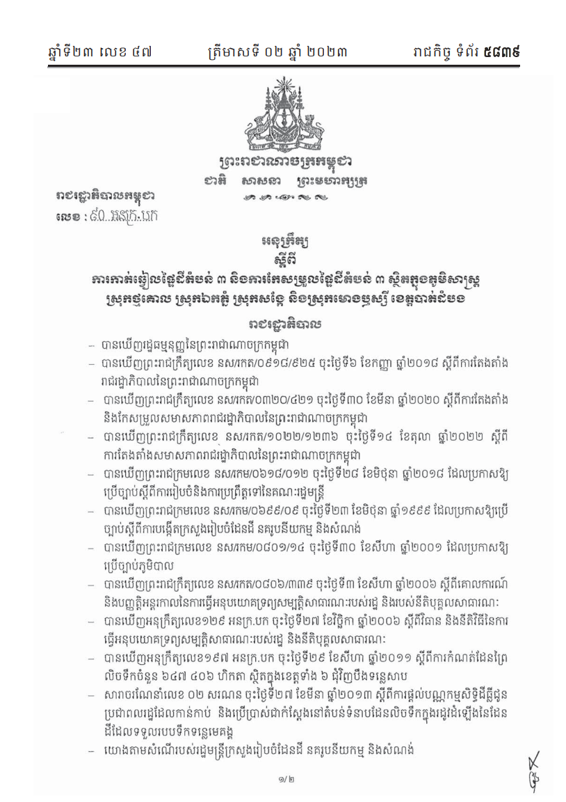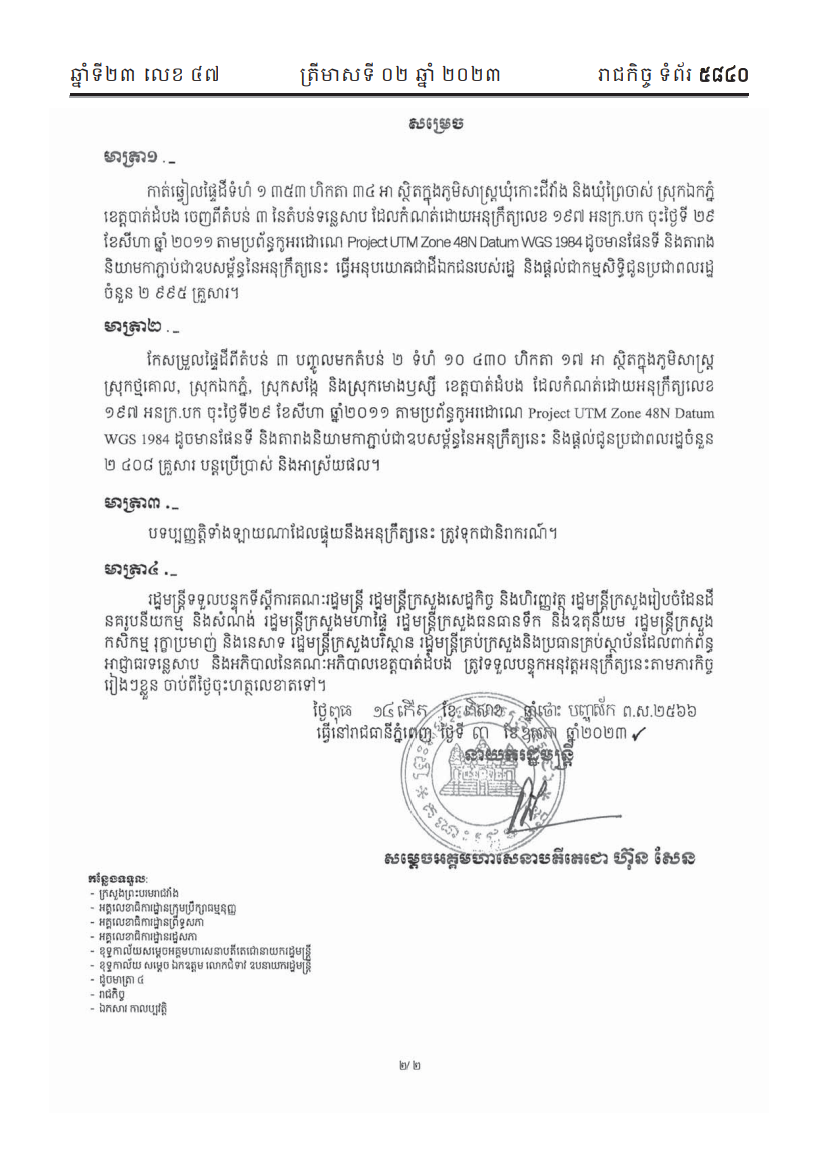 យោងតាមសៀវភៅរាជកិច្ចលេខ ៤៧ ទំព័រលេខ ៥៨៣៩ ដែលចេញផ្សាយដោយទីស្តីការគណៈរដ្ឋមន្ត្រីកាលពីថ្ងៃទី០២ ខែតុលា ឆ្នាំ២០២៣ រាជរដ្ឋាភិបាលបានចេញអនុក្រឹត្យមួយ ចុះថ្ងៃទី៣ ខែឧសភា ឆ្នាំ២០២៣ ដោយសម្រេចកាត់ឆ្វៀលផ្ទៃដីទំហំ ១ ៣៥៣ ហិកតា ៣៤អា ស្ថិតក្នុងភូមិសាស្រ្តឃុំកោះជីវាំង និងឃុំព្រៃចាស់ ស្រុកឯកភ្នំ ខេត្តបាត់ដំបង ចេញពីតំបន់៣ នៃតំបន់បឹងទន្លេសាប ដែលកំណត់ដោយអនុក្រឹត្យលេខ ១៩៧ អនក្រ.បក ចុះថ្ងៃទី២៩ ខែសីហា ឆ្នាំ២០១១ ធ្វើអនុបយោគជាដីឯកជនរបស់រដ្ឋ និងផ្តល់ជាកម្មសិទ្ធិជូនប្រជាពលរដ្ឋចំនួន ២ ៩៩៥គ្រួសារ។