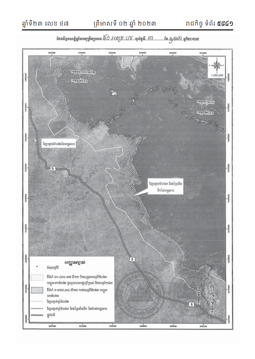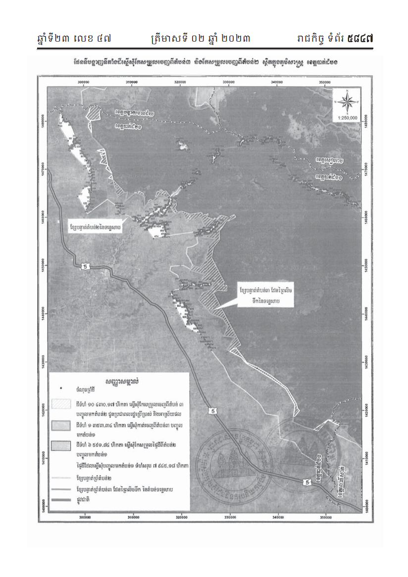រដ្ឋាភិបាល កាត់ឆ្វៀលផ្ទៃដីទំហំជាង ១ ៣០០ហិកតា ចេញពីតំបន់៣ នៃបឹងទន្លេសាប ស្ថិតក្នុងភូមិសាស្រ្តស្រុកឯកភ្នំ ខេត្តបាត់បង ដើម្បីធ្វើអនុបយោគជាដីឯកជនរបស់រដ្ឋ និងផ្តល់ជូនជាកម្មសិទ្ធិជូនប្រជាពលរដ្ឋជិត ៣ ០០០គ្រួសារ។