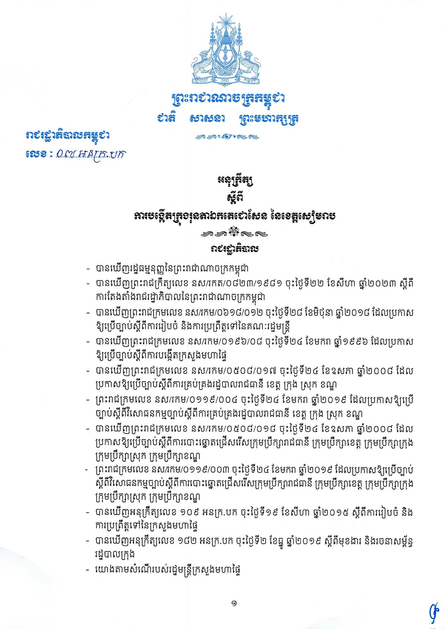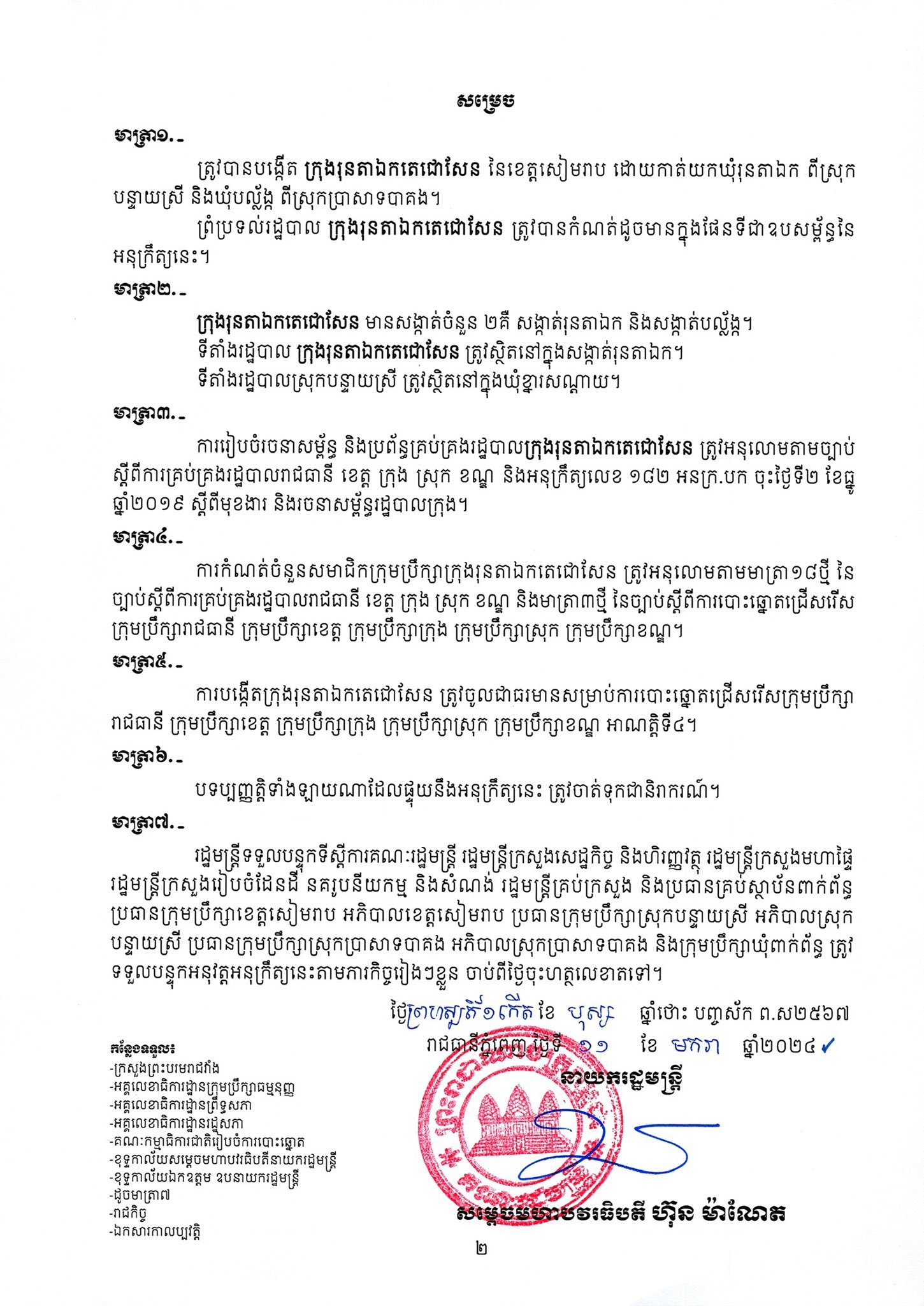 យោងតាមអនុក្រឹត្យលេខ ០៧ អនក្រ.បក ចុះថ្ងៃទី១១ ខែមករា ឆ្នាំ២០២៤ រដ្ឋាភិបាលបានសម្រេចបង្កើតក្រុងថ្មីមួយឈ្មោះ “ក្រុងរុនតាឯកតេជោសែន” ដោយកាត់យកឃុំចំនួន២ គឺឃុំរុនតាឯក ពីស្រុកបន្ទាយស្រី និងឃុំបល្ល័ង្កពីស្រុកប្រាសាទបាគង នៃខេត្តសៀមរាប។