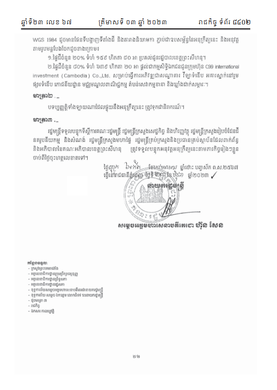 គួររំលឹកថា យោងតាមអនុក្រឹត្យចុះថ្ងៃទី៧ ខែកក្កដា ឆ្នាំ២០២៣ នៅក្នុងសៀវភៅ រាជកិច្ចលេខ៧០ រដ្ឋាភិបាលបានកាត់ឆ្វៀលដីចំនួន ៤៨៦ហិកតា នៅឃុំអូរត្រេះ ស្រុកស្ទឹងហាវ ខេត្តព្រះសីហនុ ប្រគល់ជាកម្មសិទ្ធិជូនក្រុមហ៊ុន ប៊ូយ៉ុងខ្មែរ II ខូអិលធីឌី ដែលជាបុត្រសម្ព័ន្ធរបស់ក្រុមហ៊ុន BOOYOUNG GROUP របស់សាធារណរដ្ឋកូរ៉េ៕