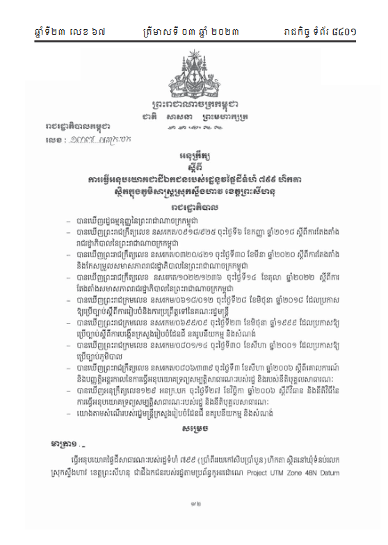 រដ្ឋាភិបាលធ្វើអនុបយោគផ្ទៃដីសាធារណៈរបស់រដ្ឋទំហំជិត ៨០០ហិកតា នៅខេត្តព្រះសីហនុ ដើម្បីបែងចែកនិងផ្តល់ជូនក្រុមហ៊ុនឯកជនធ្វើការអភវិឌ្ឍន៍សណ្ឋាគារ អាគារស្នាក់នៅរួម ផ្សារទំនើប និងមជ្ឈមណ្ឌលពាណិជ្ជកម្ម។
