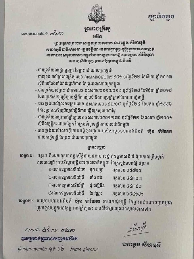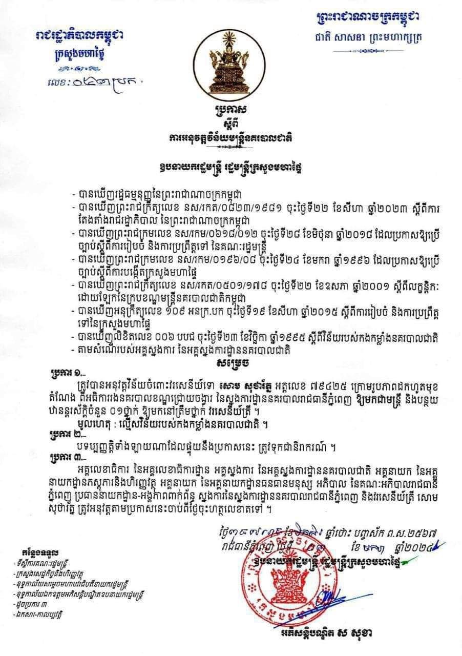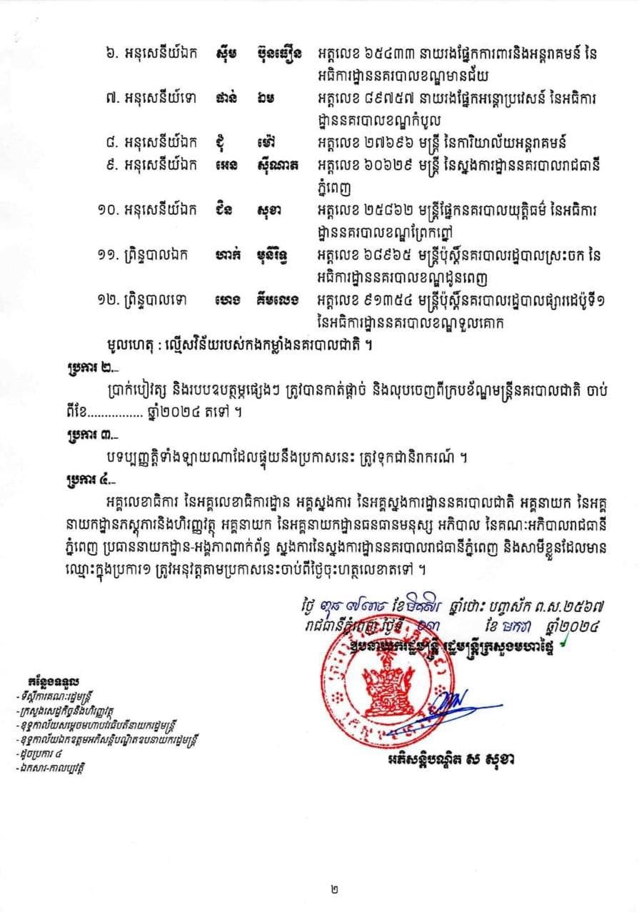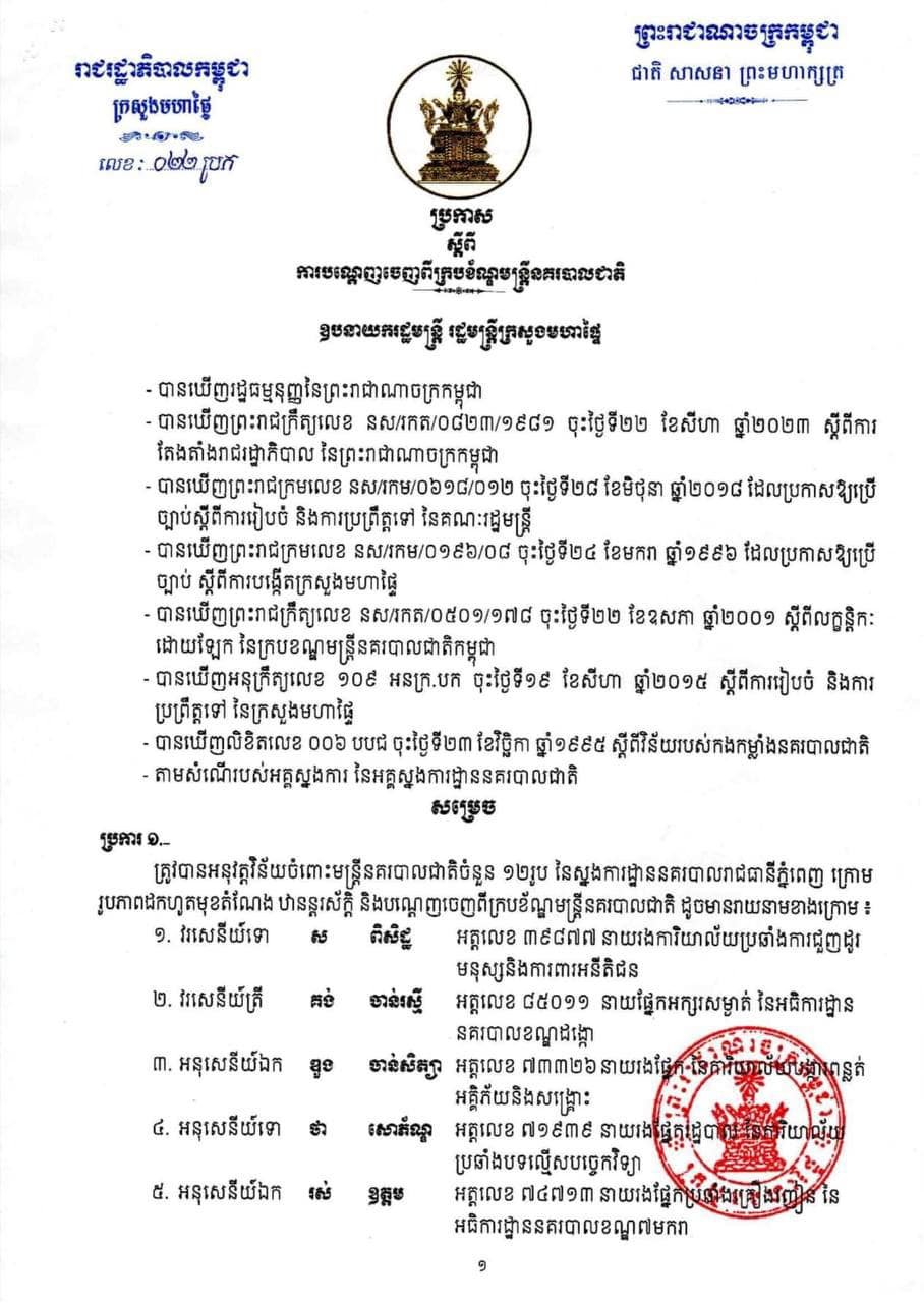 បើយោងតាមប្រកាសដាច់ដោយឡែកមួយទៀត បានបង្ហាញថា មន្ត្រីនគរបាលជាតិចាប់ពីថ្នាក់ព្រិន្ទបាលទោដល់ថ្នាក់វរសេនីយ៍ទោសរុប ១២រូប នៃស្នងការដ្ឋាននគរបាលរាជធានីភ្នំពេញ ត្រូវបានដកហូតមុខតំណែង ឋានន្តរស័ក្តិ និងបណ្តេញចេញពីក្របខណ្ឌមន្ត្រីនគរបាលជាតិ ដោយមូលហេតុល្មើសវិន័យរបស់កងកម្លាំងនគរបាលជាតិ។