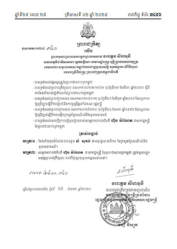 យោងតាមព្រះរាជក្រឹត្យចុះថ្ងៃទី០៩ ខែមករា ឆ្នាំ២០២៤ ក្នុងសៀវភៅរាជកិច្ចលេខ២៥ ដែលចេញផ្សាយជាសាធារណៈដោយទីស្តីការគណៈរដ្ឋមន្ត្រី កាលពីថ្ងៃទី៥ ខែមីនា ឆ្នាំ២០២៤ បានបង្ហាញថា ព្រះករុណាព្រះបាទសម្តេចព្រះបរមនាថ នរោត្តម សីហមុនី ត្រាស់បង្គាប់តែងតាំងលោក សំ សុគង់ ជាអនុរដ្ឋលេខាធិការក្រសួងប្រៃសណីយ៍ និងទូរគមនាគមន៍។