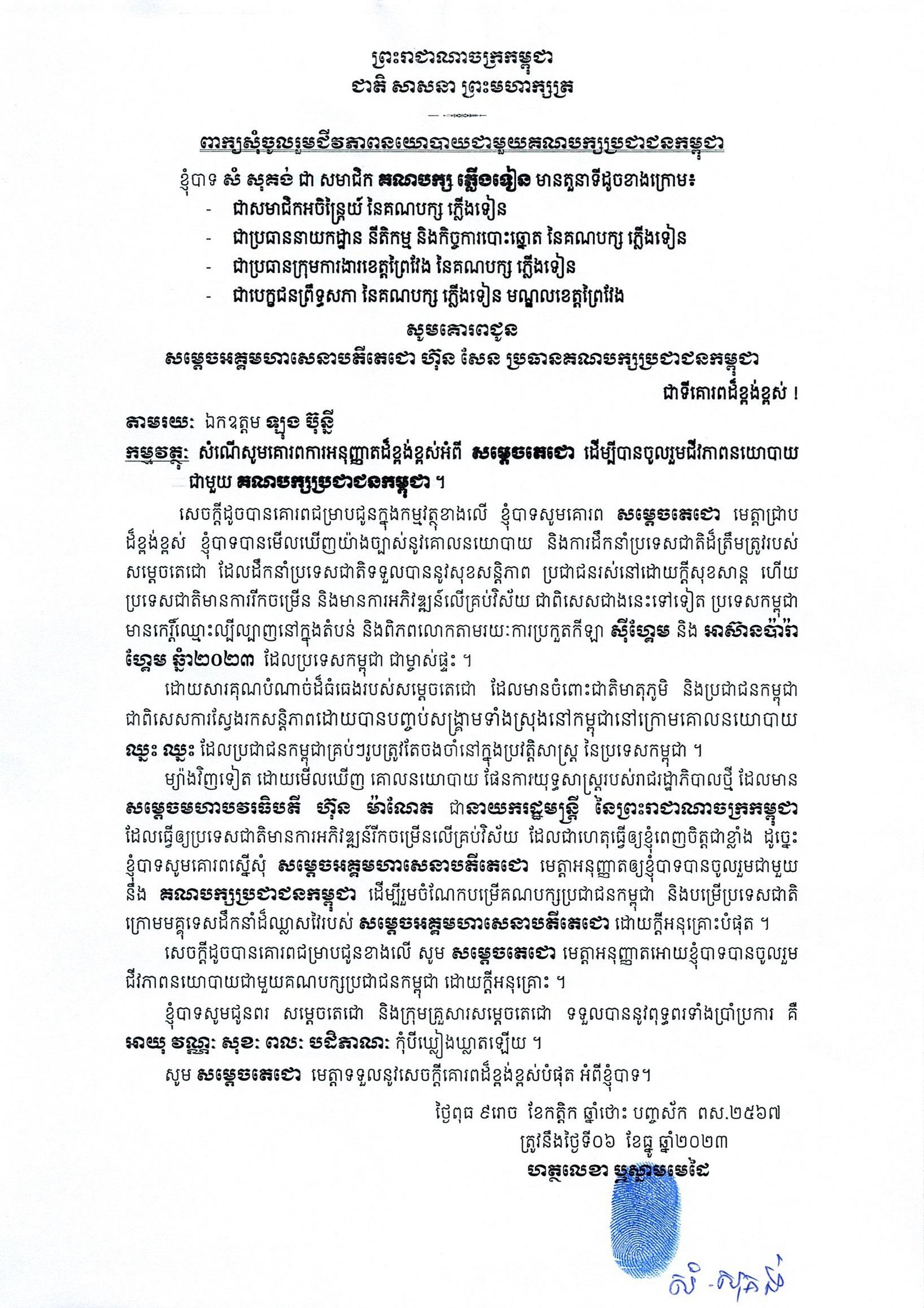 នៅក្នុងលិខិតចុះថ្ងៃទី០៦ ខែធ្នូ ឆ្នាំ២០២៣ ដែលមានភ្ជាប់ស្នាមមេដៃ និងបញ្ជាក់តួនាទីរបស់លោកជាសមាជិកអចិន្ត្រៃយ៍ ជាប្រធាននាយកដ្ឋាននីតិកម្ម និងកិច្ចការបោះឆ្នោត ជាប្រធានក្រុមការងារខេត្តព្រៃវែង និងជាបេក្ខជនព្រឹទ្ធសភា នៃគណបក្សភ្លើងទៀនសម្រាប់មណ្ឌលខេត្តព្រៃវែងផងនោះ លោក សំ សុគង់ បានស្នើសុំលោក ហ៊ុន សែន ប្រធានគណបក្សប្រជាជនកម្ពុជា ដើម្បីចូលរួមជីវភាពនយោបាយជាមួយគណបក្សនេះ។
