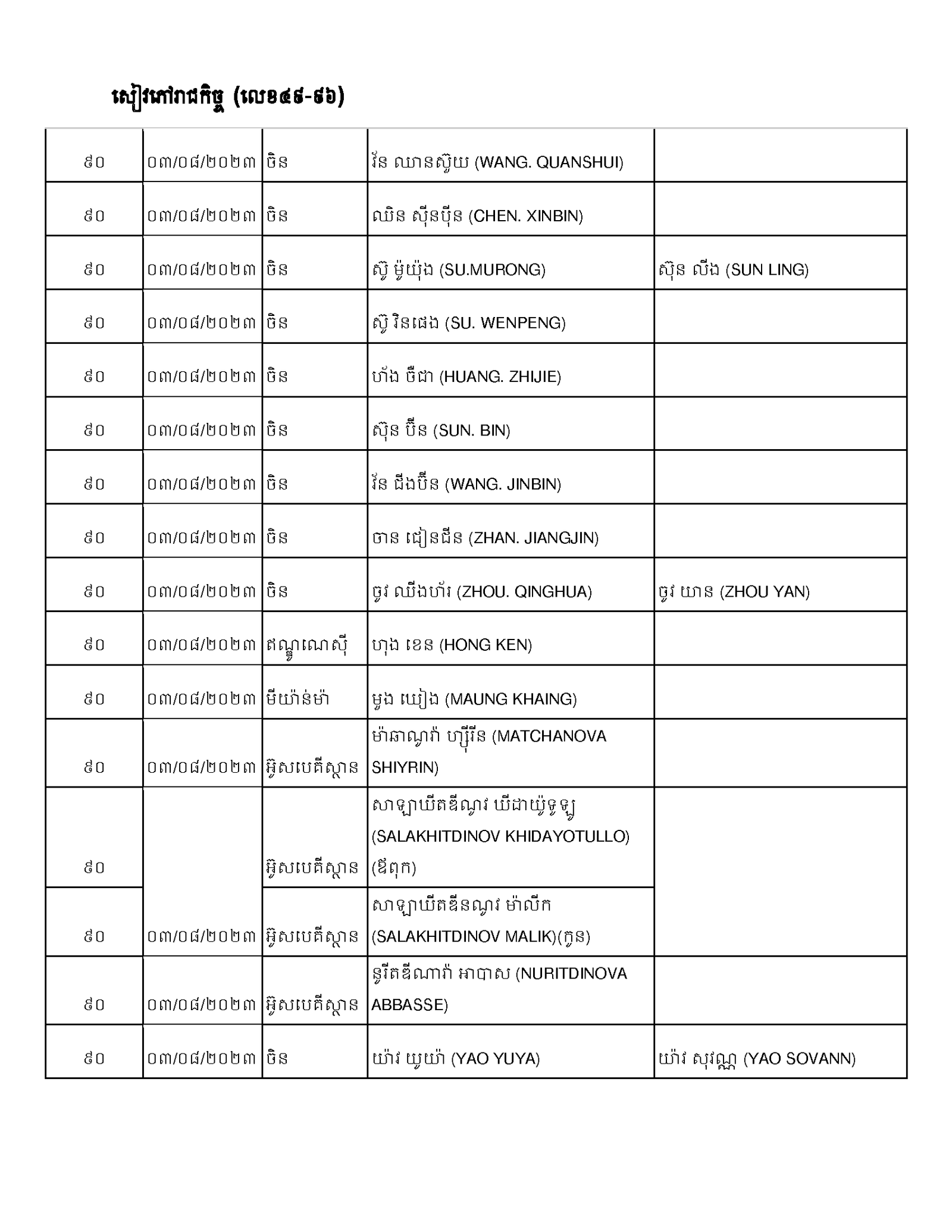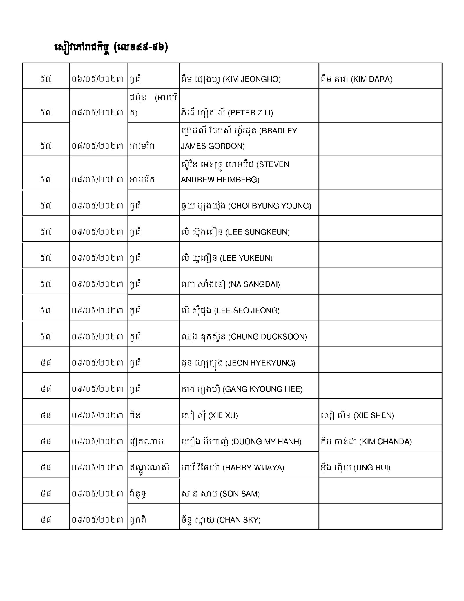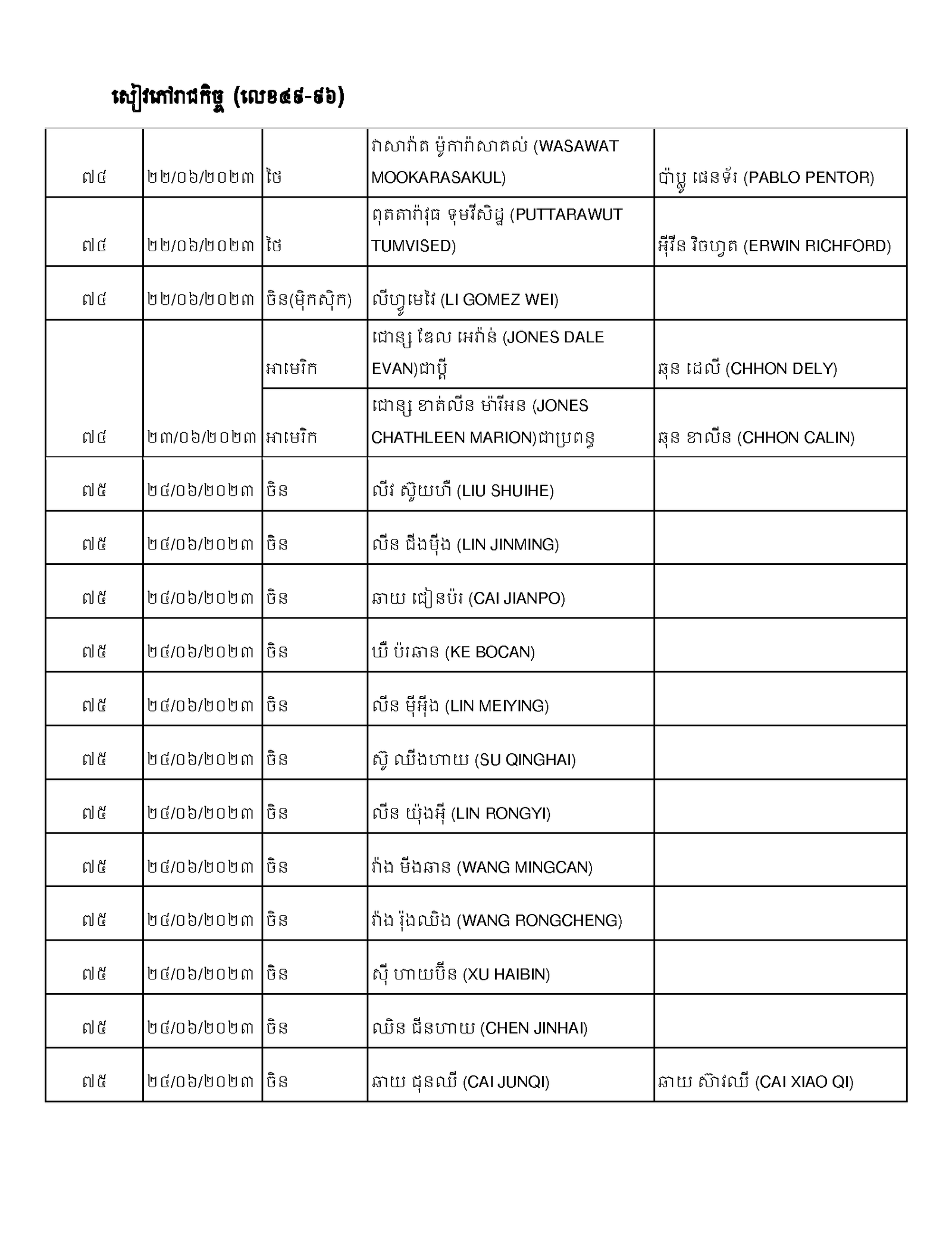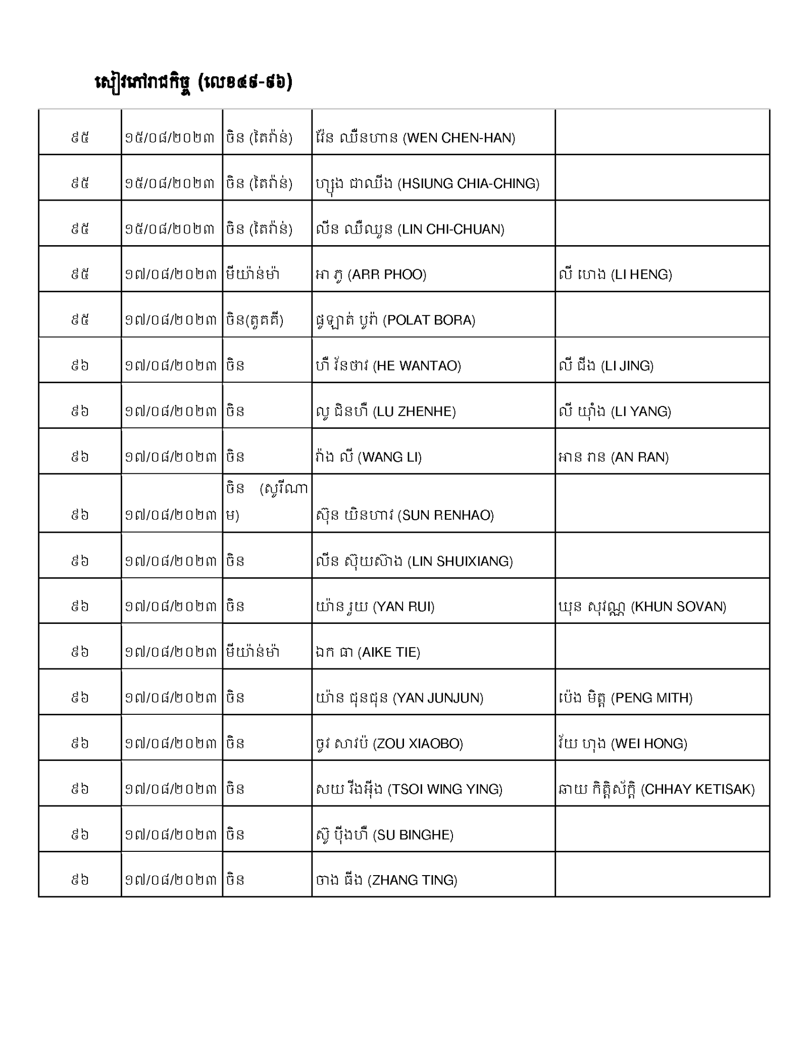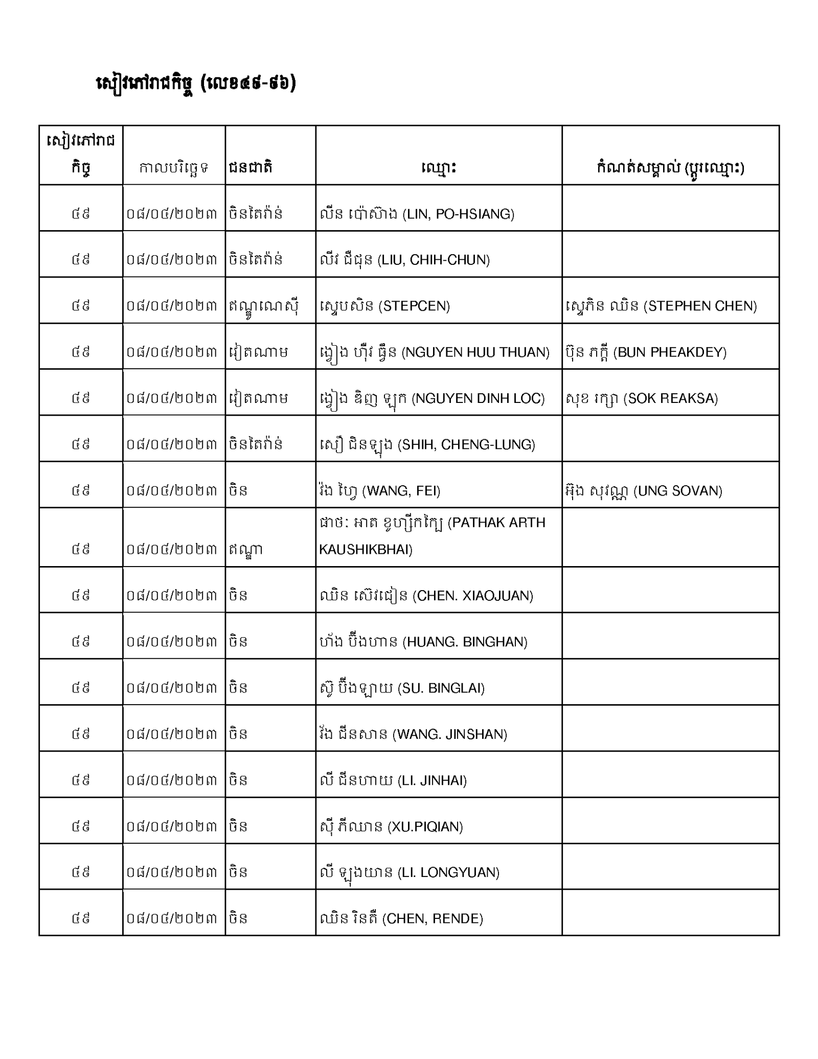តាមសៀវភៅរាជកិច្ចក្នុងត្រីមាសទី១ ក្នុងឆ្នាំ២០២៣ បានបង្ហាញថា ជនបរទេសចំនួន ៧០នាក់ ទទួ លបានសញ្ជាតិ ខ្មែរ និងចំណែកនៅ ត្រីមាសទី២ មានជនបរទេស ១៣៩នាក់ ទទួលបានសញ្ជាតិខ្មែរ។