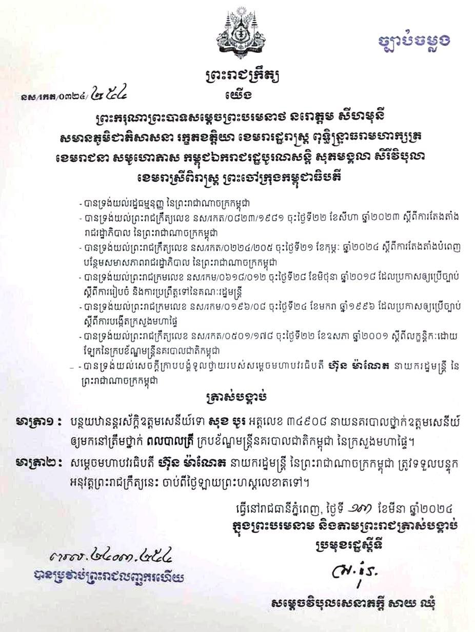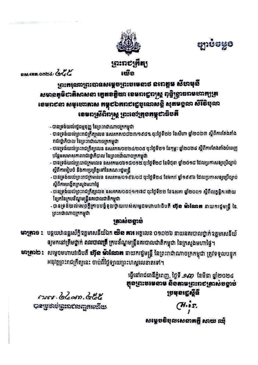​នាយ​​នគរបាល​​ថ្នាក់​​ឧត្តម​​សេនីយ៍​​ទាំង២រូប​នោះ​ រួមមាន​​​ ឧត្តម​​សេនីយ​​ឯក​ យិន​ គារ​​ អគ្គនាយក​​រង​​​នៃ​អគ្គនាយក​ដ្ឋាន​​អន្តោប្រវេសន៍​​ និង​​ឧត្តមសេនីយ៍​ទោ​​ សុខ​ សំបូរ​ ត្រូវ​​បាន​​បន្ថយ​​ឋានន្តរស័ក្តិ​ឱ្យ​​​មក​​នៅ​​ត្រឹម​​ថ្នាក់​​ពល​​បាល​​ត្រី​ នេះ​​បើ​​យោង​​តាម​​ព្រះរាជ​ក្រឹត្យ​​​ចំនួន​ ២​ ដោយ​​​​ឡែក​​ពីគ្នា​​ ចុះ​​កាលបរិច្ឆេទ​​ថ្ងៃទី​​១៣​​ ខែ​​មីនា​ ឆ្នាំ​​២០២៤​ និង​​ចុះហត្ថលេខា​​ដោយ​​ លោក​ សាយ​ ឈុំ​ ប្រមុខ​​រដ្ឋ​​ស្តីទី​​​។​​