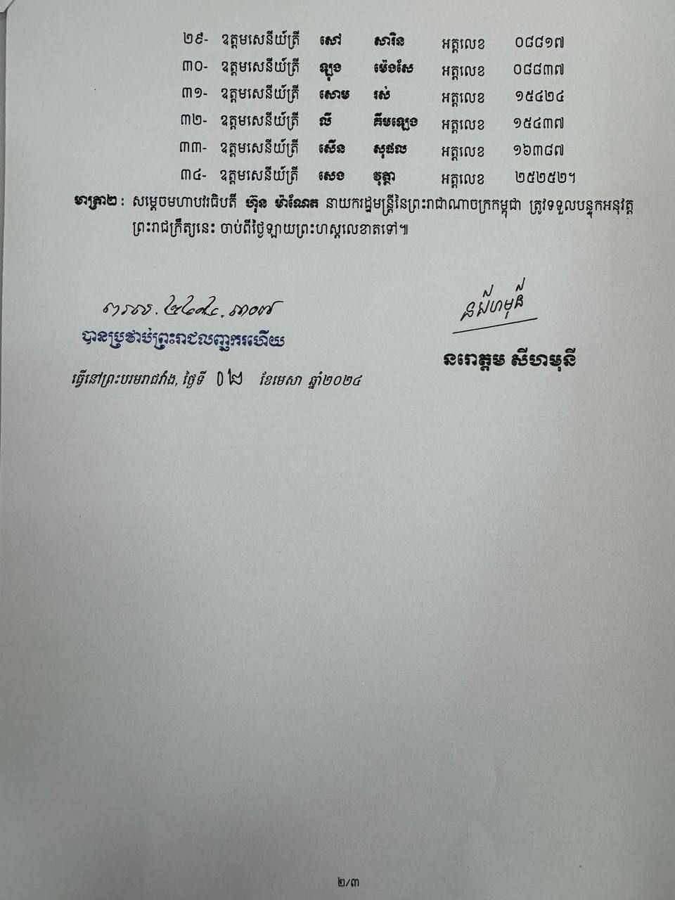 ក្នុង​​ចំណោម​​នាយ​​នគរបាល​​ថ្នាក់​​ឧត្តម​​សេនីយ៍​​ទាំង​ ​៣៥​​រូប​​​នោះ​​ មាន​​ថ្នាក់​​​នាយ​​ឧត្តម​​សេនីយ៍​​ ១​​រូប​ គឺ​នាយ​ឧត្តម​​សេនីយ៍​​ ម៉ក់​ ជី​តូ​ ដោយ​​រក្សា​​ទុក​មុខតំណែង​​នយោបាយ​​នៅ​ដដែល​​​​​ ថ្នាក់​​ឧត្តម​​សេនីយ៍​​ឯក​​មាន​ ​២​​រូប​​ ថ្នាក់​​ឧត្តម​​សេនីយ៍​​ទោ​មាន​ ​១៣​​រូប​ ​និង​​ថ្នាក់​​ឧត្តម​​សេនីយ៍​ត្រី​​មាន​ ​១៩រូប​​ នេះ​​បើ​យោង​​តាម​​ព្រះរាជ​ក្រឹត្យ​​ចុះ​​ថ្ងៃទី​​០២​ ខែមេសា​ ឆ្នាំ​​២០២៤​ ដែល​​ត្រូវ​​បាន​​ផ្សព្វផ្សាយ​​ជា​​ទូទៅ​​នៅ​លើ​​បណ្តាញ​​ព័ត៌មាន​​ក្នុង​​ស្រុក​​។​