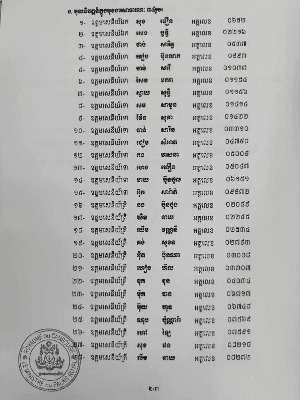 ឯកសារ​ដដែល​ បញ្ជាក់​ថា​ កា​​រដាក់​​ឱ្យ​​​ចូលនិវត្តន៍​​នេះ​ គឺ​​ធ្វើ​​ឡើង​​តាម​​សេចក្តី​​ក្រាបបង្គំទូល​ថ្វាយ​​របស់​​លោកនាយក​រដ្ឋមន្ត្រី​ ហ៊ុន​ ម៉ា​ណែ​ត​​។​​