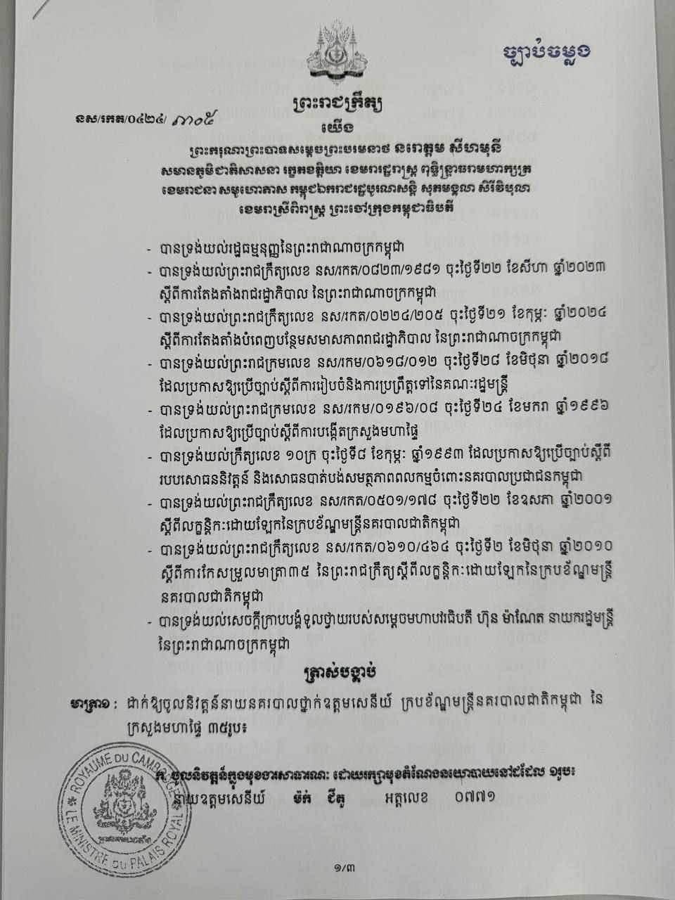ព្រះករុណា​ ព្រះបាទ​សម្តេច​ព្រះ​បរមនាថ​​​ នរោត្តម​​ សីហ​មុនី​ ​ចេញ​​ព្រះរាជ​ក្រឹត្យ​​ដាក់​​ឱ្យ​​​​នាយ​​នគរបាល​​ថ្នាក់​​ឧត្តម​​សេនីយ៍​​ ក្រប​​ខ័ណ្ឌ​​មន្ត្រី​នគរបាល​​ជាតិ​​នៃ​ក្រ​​សួង​​​មហាផ្ទៃ​​ ៣៥​​រូប​​ ចូលនិវត្តន៍​​ក្នុង​​មុខ​​ងារ​​សាធារណៈ​។​​