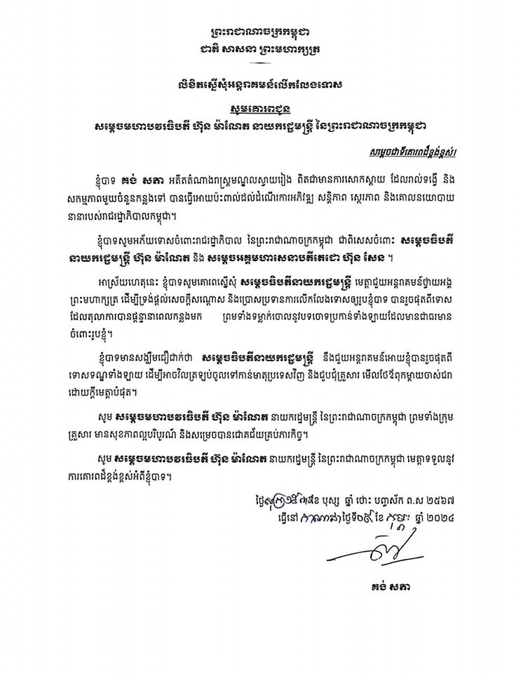 តាមរយៈលិខិតមួយច្បាប់ធ្វើនៅប្រទេសកាណាដា ចុះថ្ងៃទី០៩ ខែកុម្ភៈ ឆ្នាំ២០២៤ លោក គង់ សភា អតីតតំណាងរាស្ត្រមណ្ឌលស្វាយរៀងមកពីគណបក្សសង្គ្រោះជាតិបានសម្តែងការសោកស្តាយនិងសុំការអភ័យទោសពីរដ្ឋាភិបាល ជាពិសេសពីលោកនាយករដ្ឋមន្ត្រី ហ៊ុន ម៉ាណែត និងលោក ហ៊ុន សែន ប្រធានគណបក្សប្រជាជនកម្ពុជា។