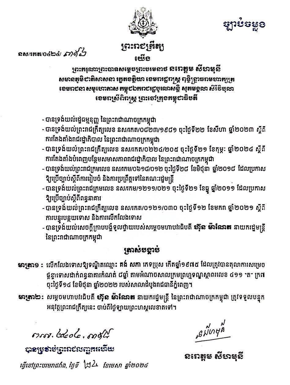 ព្រះករុណាព្រះបាទសម្តេចព្រះបរមនាថ នរោត្តម សីហមុនី បានត្រាស់បង្គាប់លើកលែងទោសលោក គង់ សភា ដែលត្រូវបានតុលាការសម្រេចផ្តន្ទាទោសដាក់ពន្ធនាគារកំណត់៨ឆ្នាំ តាមអំណាចសាលក្រមព្រហ្មទណ្ឌ ចុះថ្ងៃទី១៤ ខែមិថុនា ឆ្នាំ២០២២ របស់សាលាដំបូងរាជធានីភ្នំពេញ នេះបើយោងតាមព្រះរាជក្រឹត្យចុះថ្ងៃទី២៤ ខែមេសា ឆ្នាំ២០២៤។