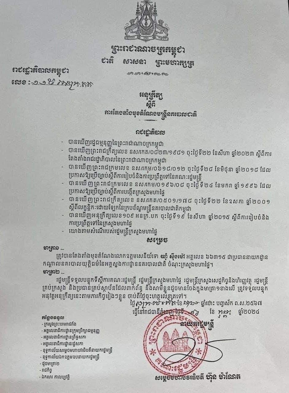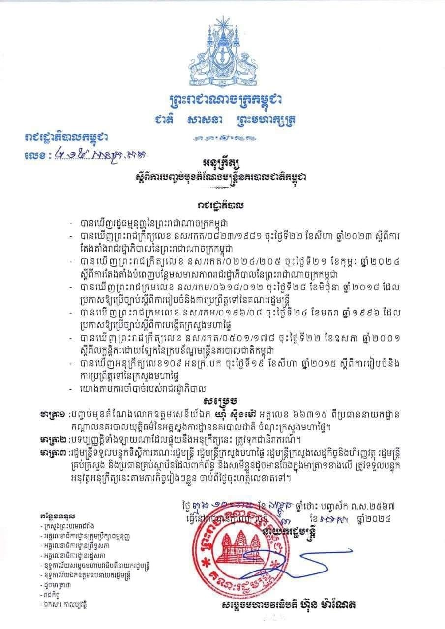 យោងតាមអនុក្រឹត្យចុះកាលបរិច្ឆេទថ្ងៃទី០៣ ខែមេសា ឆ្នាំ២០២៤ និងមានចុះហត្ថលេខាដោយលោកនាយករដ្ឋមន្ត្រី ហ៊ុន ម៉ាណែត ដែលត្រូវបានផ្សព្វផ្សាយជាសាធារណៈដោយបណ្តាញព័ត៌មានក្នុងស្រុក រដ្ឋាភិបាល បានសម្រេចបញ្ចប់មុខតំណែងលោកឧត្តមសេនីយ៍ឯក យ៉ាំ ស៊ីងម៉ៅ ពីប្រធាននាយដ្ឋានកណ្ដាលនគរបាលយុត្តិធម៌។