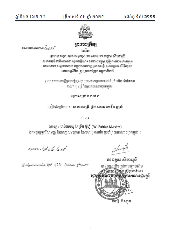 ឯកអគ្គរដ្ឋទូតសហរដ្ឋអាមេរិកប្រចាំនៅកម្ពុជា លោក ដាប់ប៊លយូ ភែទ្រីក ម៉ុហ្វី (W. Patrick Murphy) ដែលនឹងត្រូវបញ្ចប់អាណត្តិការងាររបស់លោក នាចុងខែឧសភានេះ ត្រូវបានព្រះមហាក្សត្រប្រោសប្រទានគ្រឿងឥស្សរិយយសសហមេត្រី ថ្នាក់មហាសេរី វឌ្ឍន៍។
