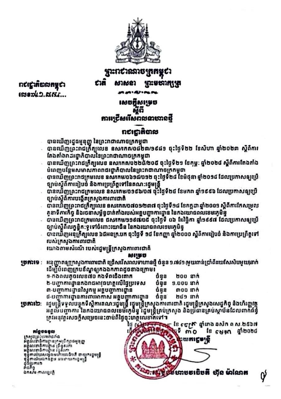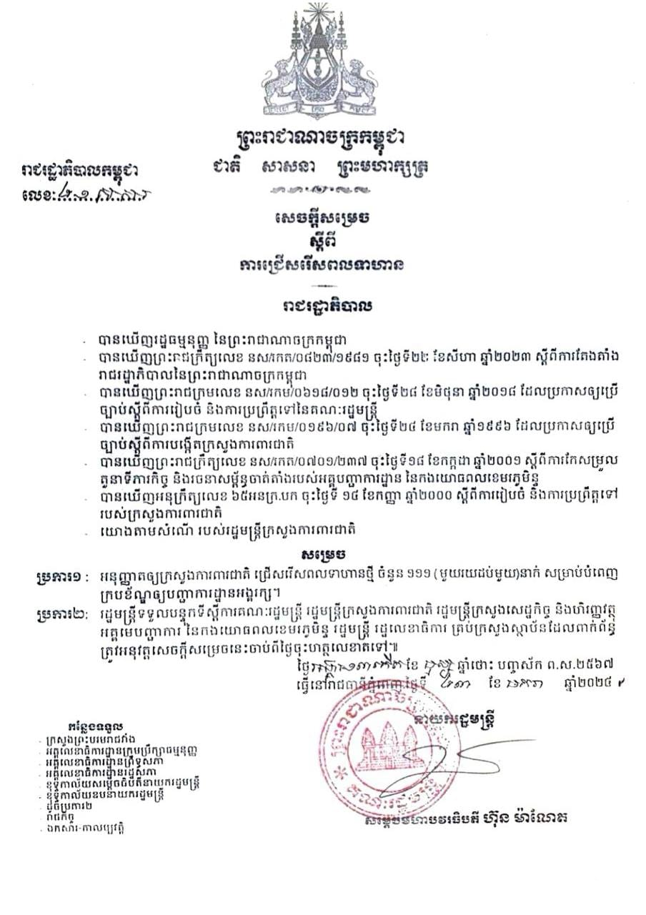សេចក្តី​​សម្រេច​នេះ​ បញ្ជាក់​ទៀត​​ថា​  ការ​​ជ្រើសរើស​​ពលទាហាន​​ថ្មីនេះ​ ​ត្រូវ​​បាន​ ​ធ្វើ​​ឡើង​​ទៅតាម​​សំណើ​​របស់​​ក្រសួង​​ការ​​ពារ​​ជាតិ​​។​​
