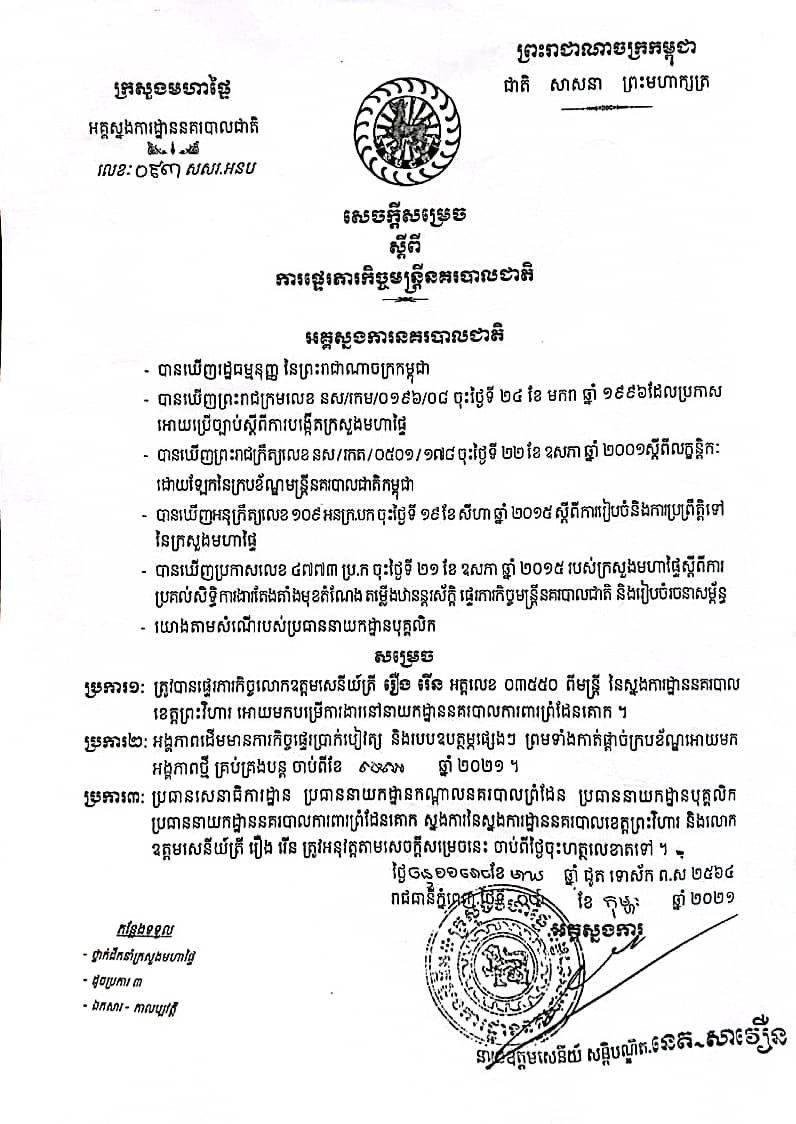 កាលពីថ្ងៃទី២២ ខែធ្នូ ឆ្នាំ២០២០ លោក រឿង រើន ត្រូវបានក្រសួងមហាផ្ទៃចេញ ប្រកាសបញ្ចប់មុខតំណែងពីស្នងការរងទទួលផែនអន្តរាគមន៍ និងតម្រួតបទប ញ្ជា នៃស្នងការដ្ឋាននគរបាលខេត្តព្រះវិហារ មូលហេតុល្មើសវិន័យរបស់កងកម្លាំងនគរបាលជាតិ។ ប៉ុន្តែនៅថ្ងៃទី០៨ ខែកុម្ភៈ ឆ្នាំ២០២១ លោក រឿង រើន ត្រូវបានអគ្គស្នងការនគរបាលជាតិចេញសេចក្តីស ម្រេចផ្ទេរភារកិច្ចពីមន្ត្រី នៃស្នងការដ្ឋាននគរបាលខេត្តព្រះវិហារឲ្យមកបម្រើការ ងារនៅនាយកដ្ឋាននគរបាលការពារព្រំដែនគោក។