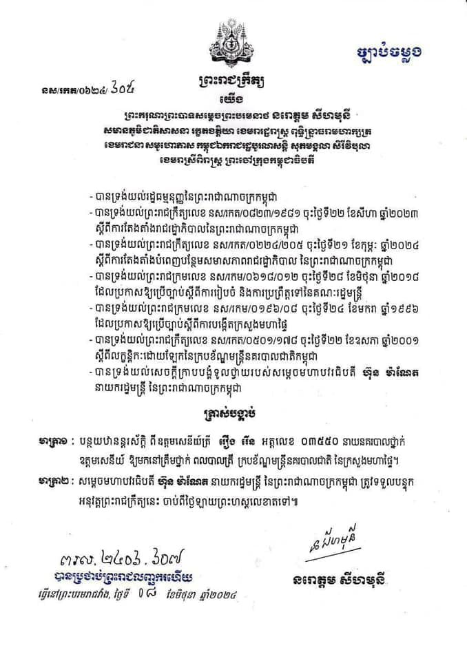 យោងតាមព្រះរាជក្រឹត្យចុះថ្ងៃទី០៨ ខែមិថុនា ឆ្នាំ២០២៤ ព្រះបាទសម្តេចព្រះបរមនាថ នរោត្តម សីហមុនី បានត្រាស់បង្គាប់បន្ថយឋានន្តរស័ក្តិឧត្តមសេនីយ៍ត្រី រឿង រើន នាយនគរបាលថ្នាក់ឧត្តមសេនីយ៍ ឱ្យមកនៅត្រឹមថ្នាក់ ពលបាលត្រី ក្របខ័ណ្ឌមន្ត្រីនគរបាលជាតិ នៃក្រសួងមហាផ្ទៃ។