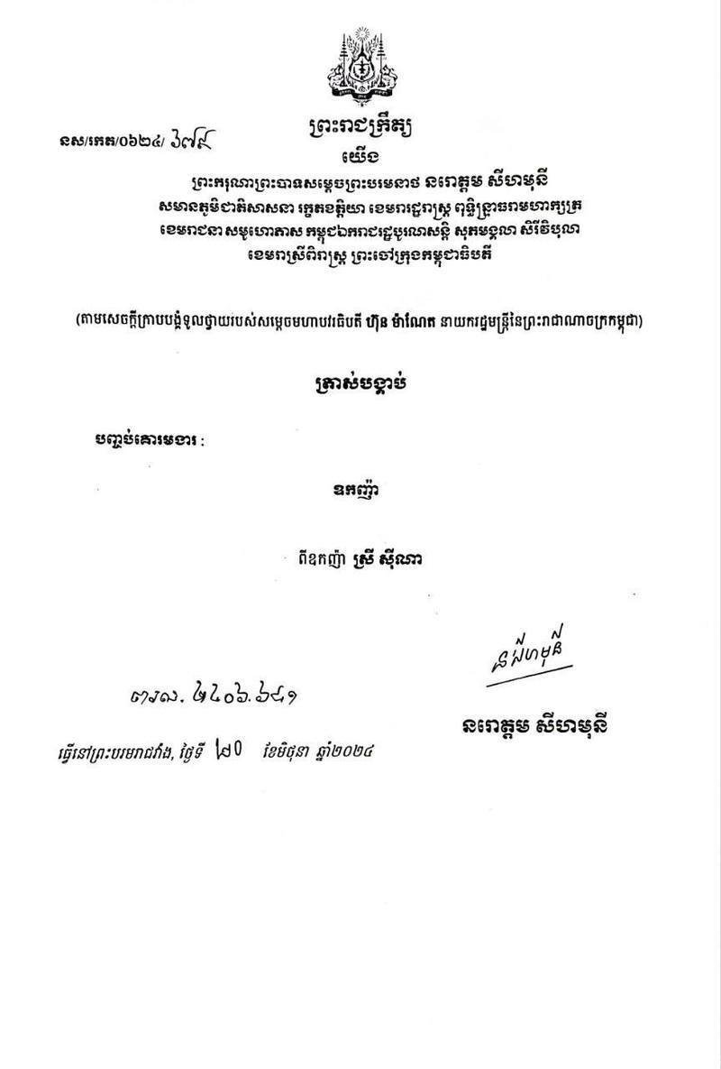 យោង​​តាម​​ព្រះរាជ​ក្រឹត្យ​​ចុះ​​ថ្ងៃទី​​២០​​ ខែមិថុនា​ ឆ្នាំ​​២០២៤​ ​បាន​​ឱ្យ​​​ដឹង​​ថា​ ព្រះ​មហា​​ក្សត្រ​​បាន​​ត្រាស់​​បង្គាប់​​បញ្ចប់​​គោរម​​ងារ​​ឧកញ៉ា​ ពី​ឧកញ៉ា​​ ស្រី​ ស៊ី​ណា​ ។​​ ការ​​បញ្ចប់​​គោរម​​ងារ​​នេះ​​ ធ្វើ​​ឡើង​​តាម​​សេចក្តី​​ក្រាប​​បង្គំ​​ទូល​​ថ្វាយ​​របស់​​លោក​​នាយក​​រដ្ឋ​​មន្ត្រី​ ហ៊ុន​ ម៉ា​ណែ​ត​​។​​