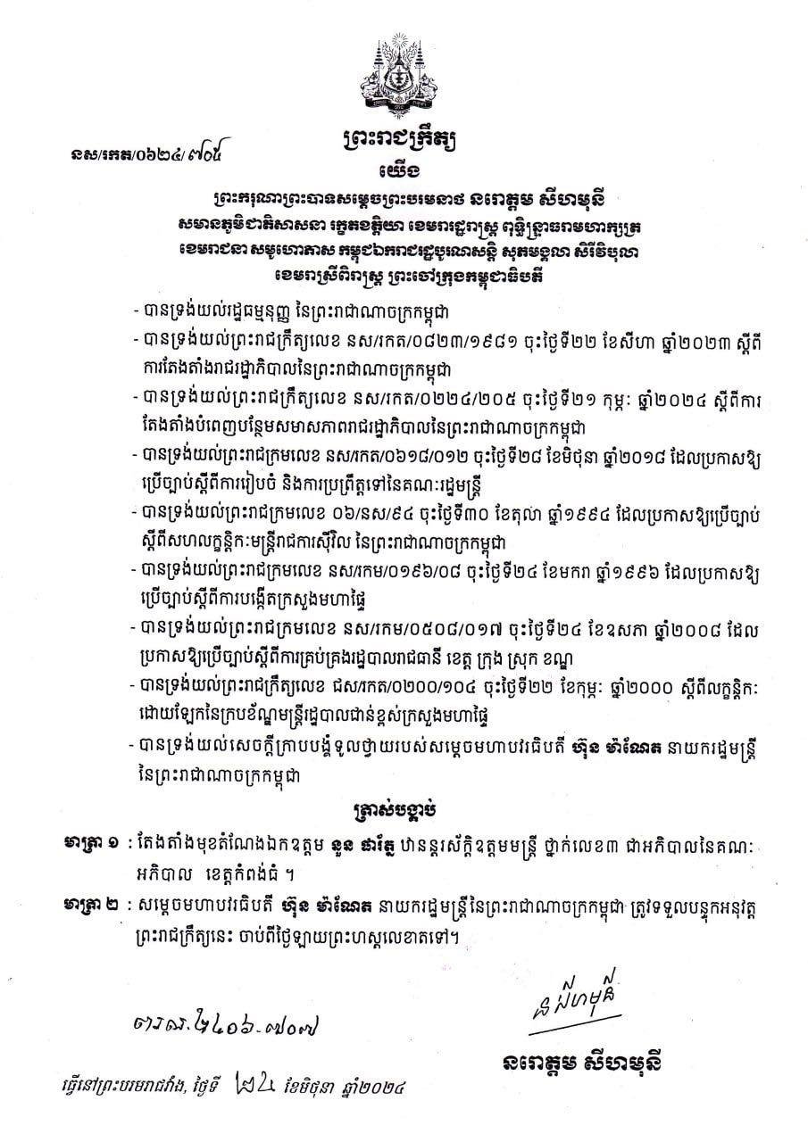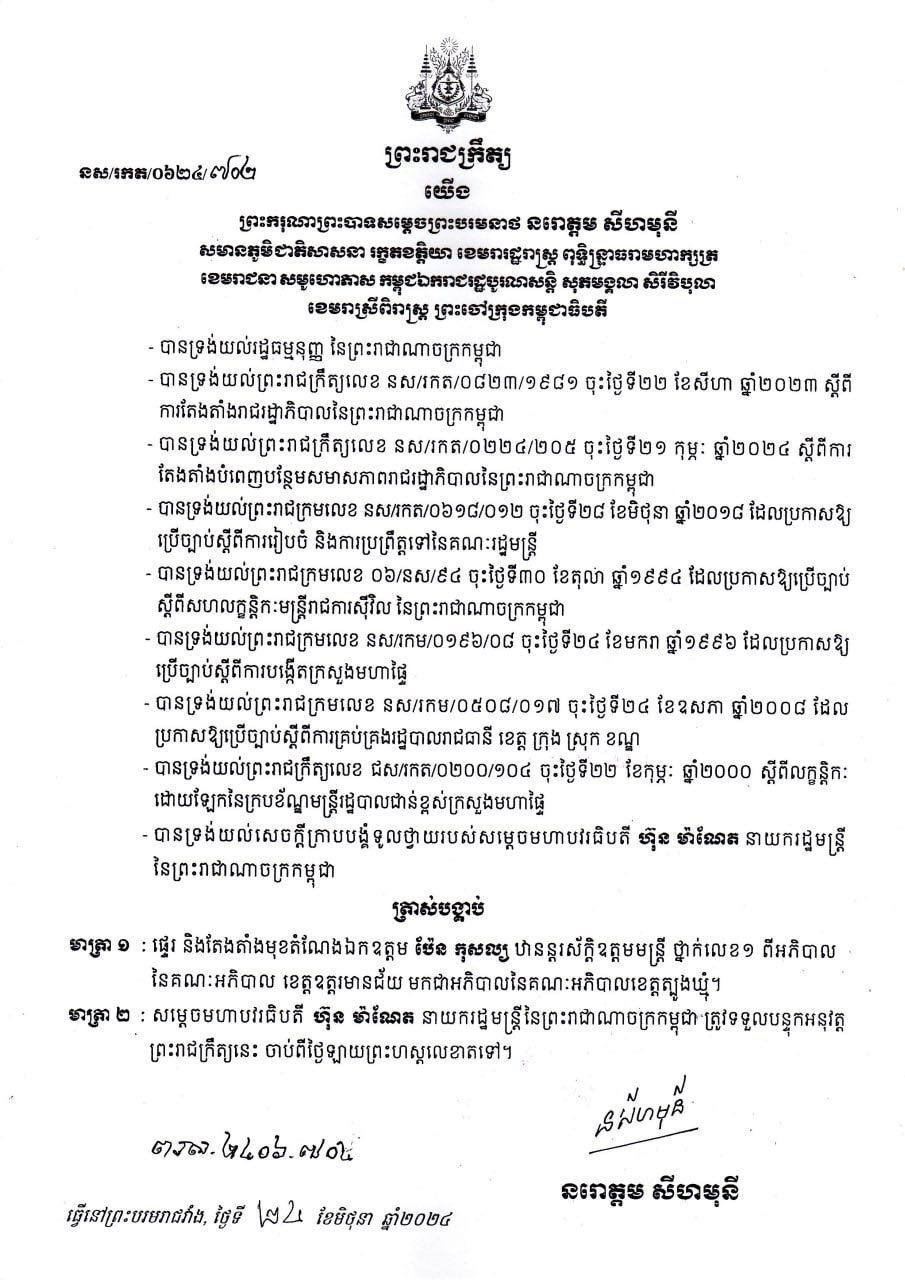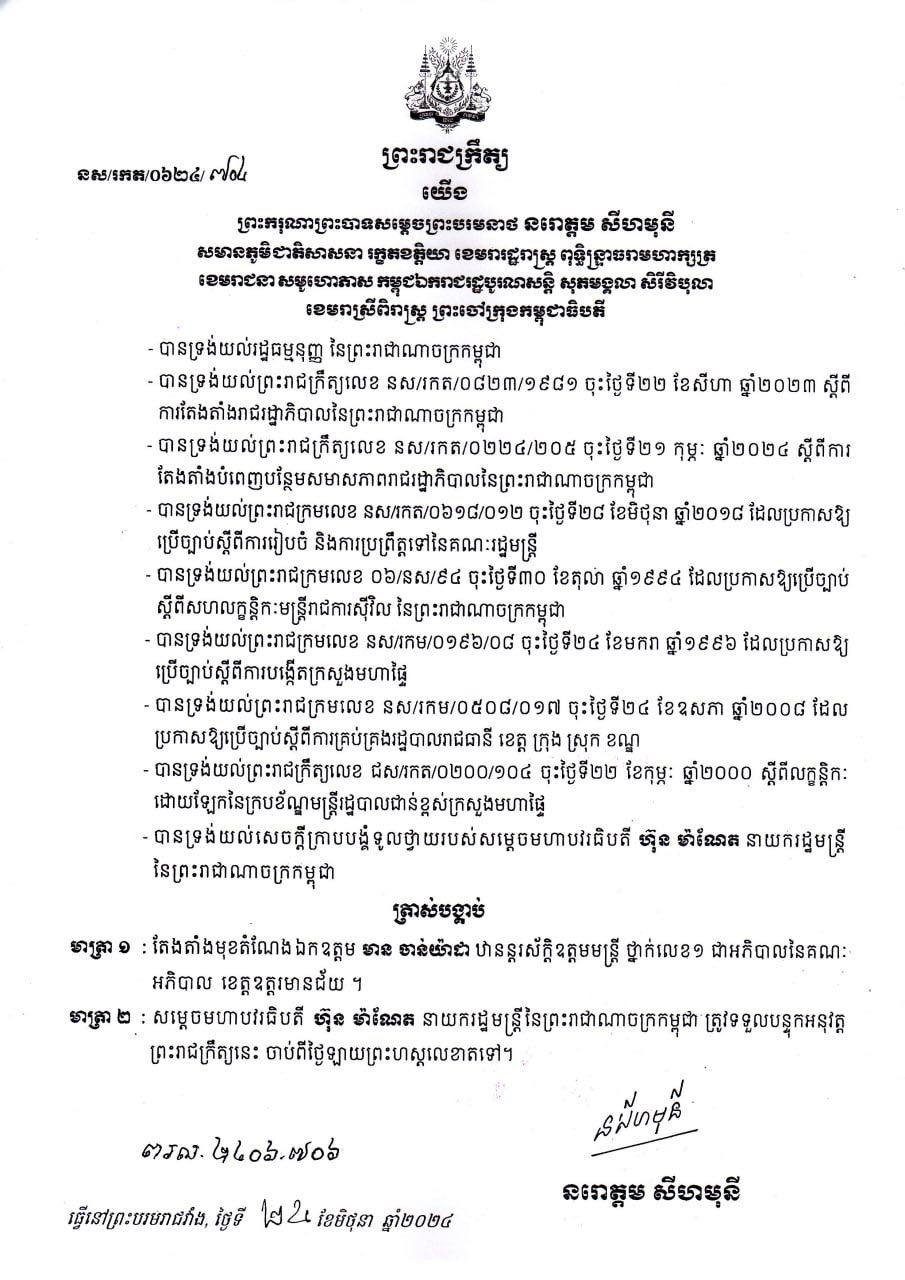ព្រះករុណា ព្រះបាទសម្តេចព្រះបរមនាថ នរោត្តម សីហមុនី ចេញព្រះរាជក្រឹត្យ ត្រាស់បង្គាប់ផ្លាស់ប្តូរ និងតែងតាំងមុខតំណែងអភិបាលខេត្តចំនួន៨។