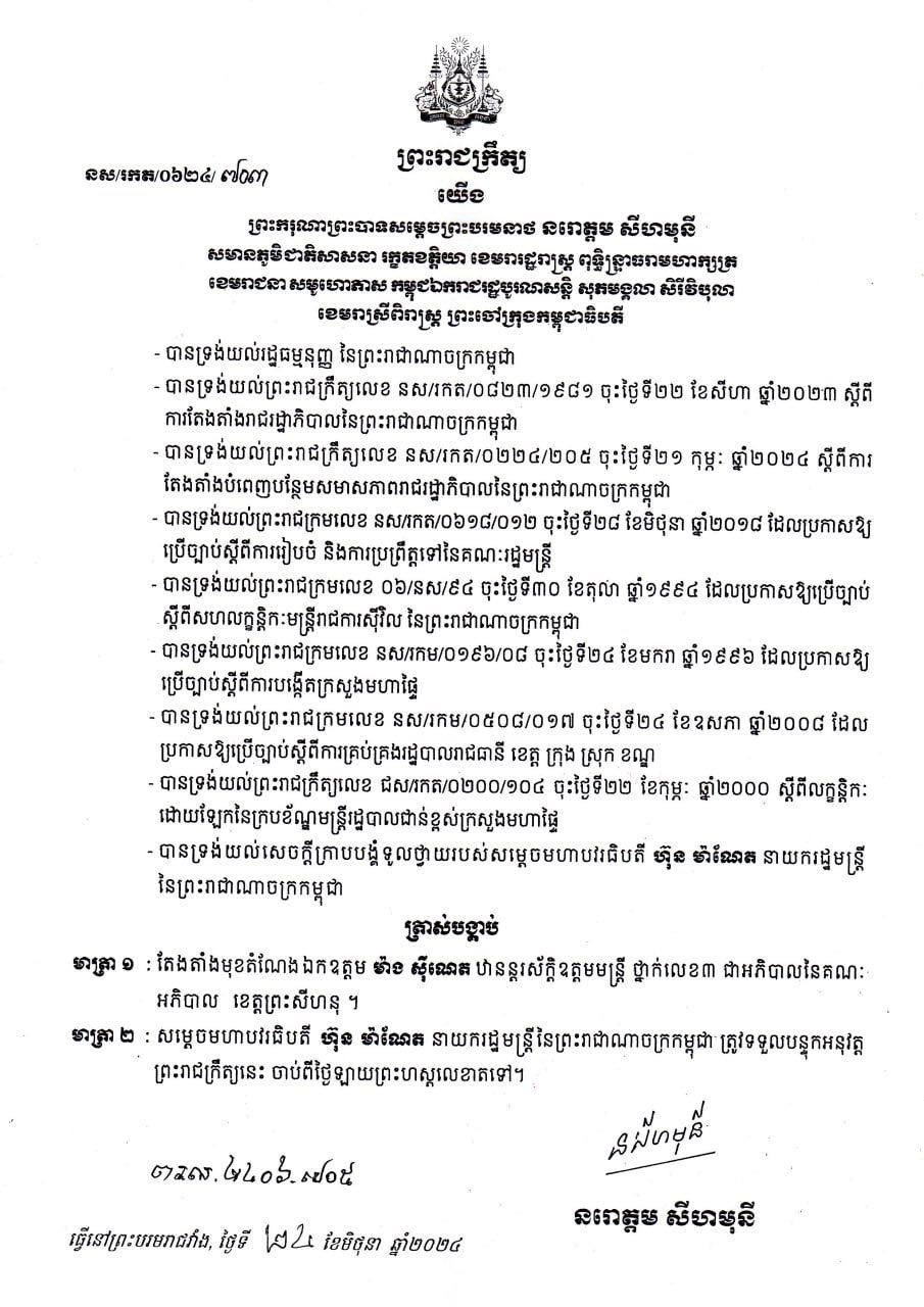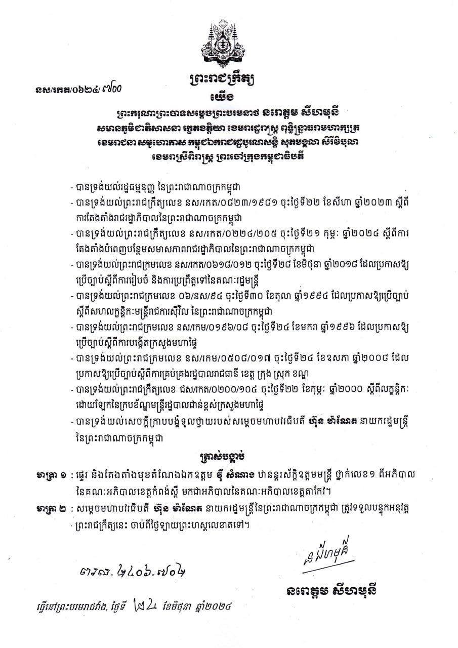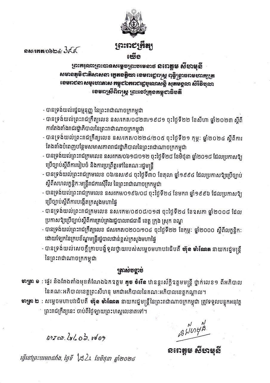 ព្រះករុណា ព្រះបាទសម្តេចព្រះបរមនាថ នរោត្តម សីហមុនី ចេញព្រះរាជក្រឹត្យ ត្រាស់បង្គាប់ផ្លាស់ប្តូរ និងតែងតាំងមុខតំណែងអភិបាលខេត្តចំនួន៨។