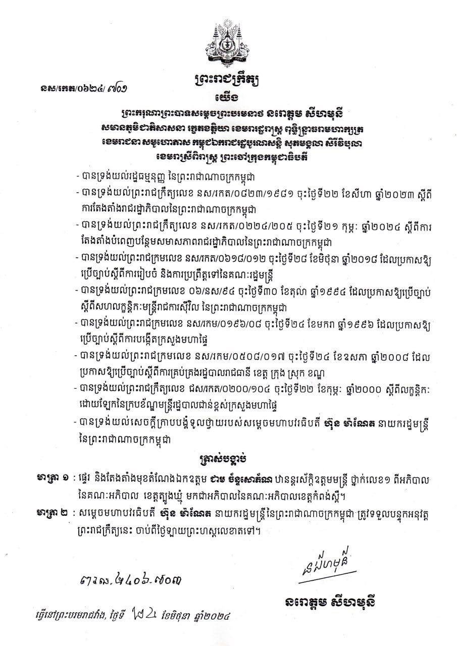 យោងតាមព្រះរាជក្រឹត្យដាច់ដោយឡែកពីគ្នាចំនួន១២ និងមានចុះកាលបរិច្ឆេទថ្ងៃទី២៤ ខែមិថុនា ឆ្នាំ២០២៤ ដូចៗគ្នា បានឱ្យដឹងថា ព្រះមហាក្សត្រ បានត្រាស់បង្គាប់ផ្ទេរ និងតែងតាំងមុខតំណែងអភិបាលខេត្តចំនួន ៤រូប ដែលក្នុងនោះលោក ជាម ច័ន្ទសោភ័ណ អភិបាលខេត្តត្បូងឃ្មុំ ត្រូវបានប្តូរទៅកាន់ខេត្តកំពង់ស្ពឺ, លោក គួច ចំរើន អភិបាលខេត្តព្រះសីហនុ ត្រូវបានប្តូរទៅកាន់ខេត្តកណ្តាល, លោក វ៉ី សំណាង អភិបាលខេត្តកំពង់ស្ពឺ ត្រូវបានប្តូរទៅកាន់ខេត្តតាកែវ, លោក ប៉ែន កុសល្យ អភិបាលខេត្តឧត្តរមានជ័យ ត្រូវបានប្តូរទៅកាន់ខេត្តត្បូងឃ្មុំ។