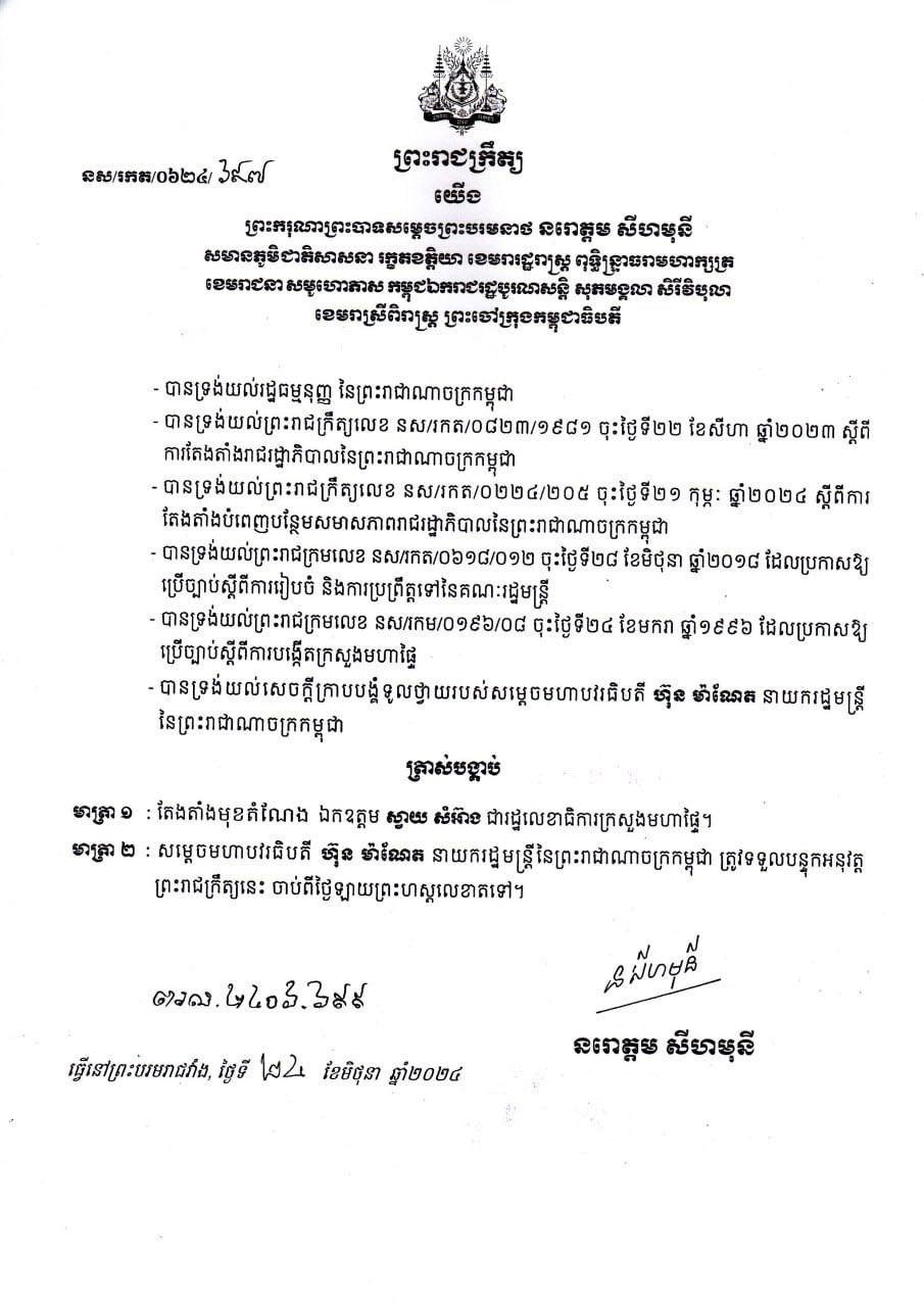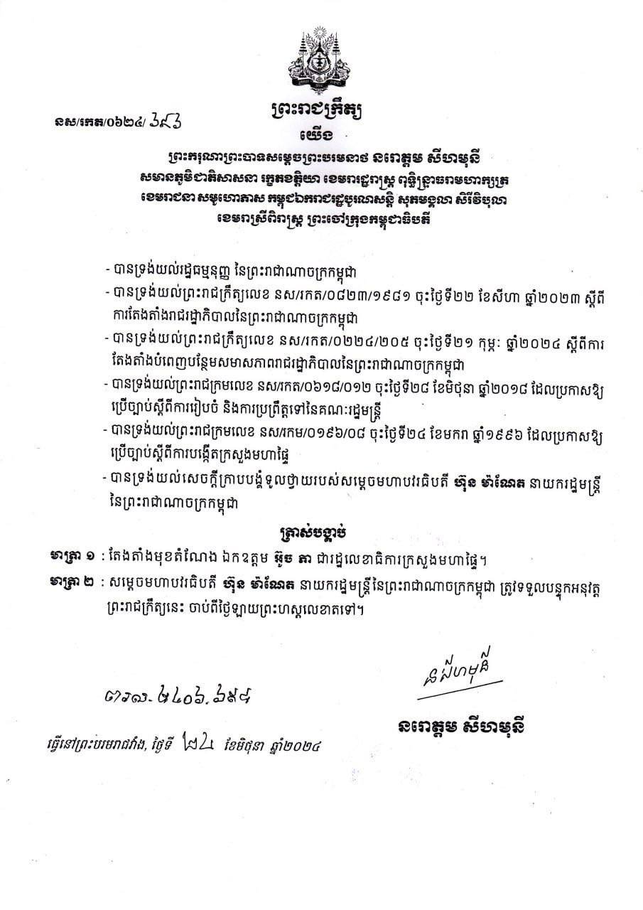 ចំណែក អភិបាលខេត្តចំនួន ៤រូបផ្សេងទៀត រួមមាន លោក ស្វាយ សំអ៊ាង អភិបាលខេត្តស្ទឹងត្រែង លោក អ៊ូច ភា អភិបាលខេត្តតាកែវ លោក គង់ សោភ័ណ អភិបាលខេត្តកណ្តាល និងលោក ងួន រតនៈ អភិបាលខេត្តកំពង់ធំ ត្រូវបានមហាក្សត្រ ត្រាស់បង្គាប់តែងតាំងជារដ្ឋលេខាធិការក្រសួងមហាផ្ទៃ៕