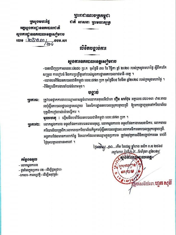 ដោយឡែកកាលពីថ្ងៃទី១៦ ខែមិថុនា ឆ្នាំ២០២៤ ស្នងការដ្ឋាននគរបាលខេត្តសៀមរាប បានចេញលិខិតបង្គាប់ការផ្អាកការងារបណ្តោះអាសន្នលោកអនុសេនីយ៍ទោ រឿន សារ៉ាវុធ ឋានៈនាយរងប៉ុស្តិ៍នគរបាលរដ្ឋបាលខ្នារសណ្តាយ នៃអធិការដ្ឋាននគរបាលស្រុកបន្ទាយស្រី ឱ្យមកបង្ហាញមុខនៅការិយាល័យបុគ្គលិករៀងរាល់ម៉ោងធ្វើការ ដោយសារល្មើសនឹងបទវិន័យនគរបាលជាតិកម្ពុជា។