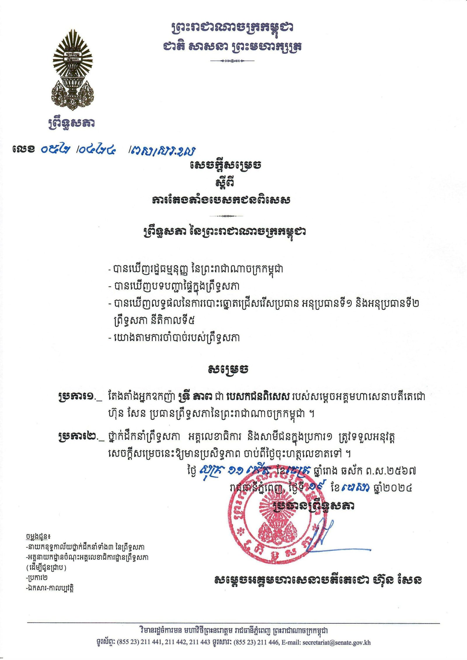 យោងតាមសេចក្តីសម្រេច ចុះថ្ងៃទី១៩ ខែមេសា ឆ្នាំ២០២៤ និងមានចុះហត្ថលេខាដោយលោក ហ៊ុន សែន ដែលត្រូវបានផ្សព្វផ្សាយជាសាធារណៈដោយបណ្តាញព័ត៌មានក្នុងស្រុក បានសម្រេចតែងតាំងលោក ទ្រី ភាព ជាបេសកជនពិសេសរបស់ លោក ហ៊ុន សែន ប្រធានព្រឹទ្ធសភាកម្ពុជា។