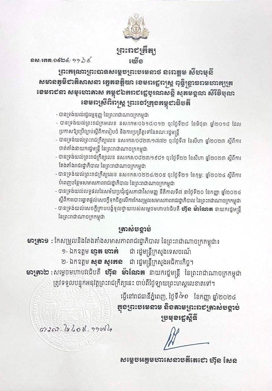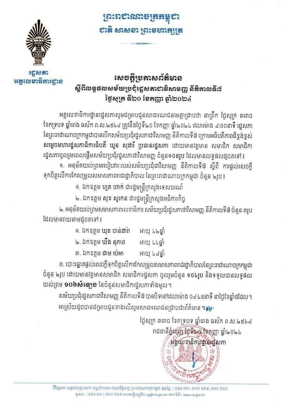 យោងតាមសេចក្តីប្រកាសព័ត៌មានស្តីពីលទ្ធផលសម័យប្រជុំរដ្ឋសភាវិសាមញ្ញ នីតិកាលទី៧ ថ្ងៃសុក្រ ទី២០ ខែកញ្ញា ឆ្នាំ២០២៤ បានឲ្យដឹងថា រដ្ឋសភាបានបោះឆ្នោតផ្តល់សេចក្តីទុកចិត្តលើការកែសម្រួលសមាសភាពរាជរដ្ឋាភិបាលចំនួនពីររូប គឺលោក ហួត ហាក់ មកកាន់តំណែងជារដ្ឋមន្ត្រីក្រសួងទេសចរណ៍ ខណៈលោក សុខ សូកេន មកកាន់តំណែងជារដ្ឋមន្ត្រីក្រសួងអធិការកិច្ច ដោយទទួលបានលទ្ធផលយល់ព្រម ១០៦លើ១០៦សំឡេង នៃសមាជិក សមាជិការដ្ឋសភាដែលមានវត្តមាន។