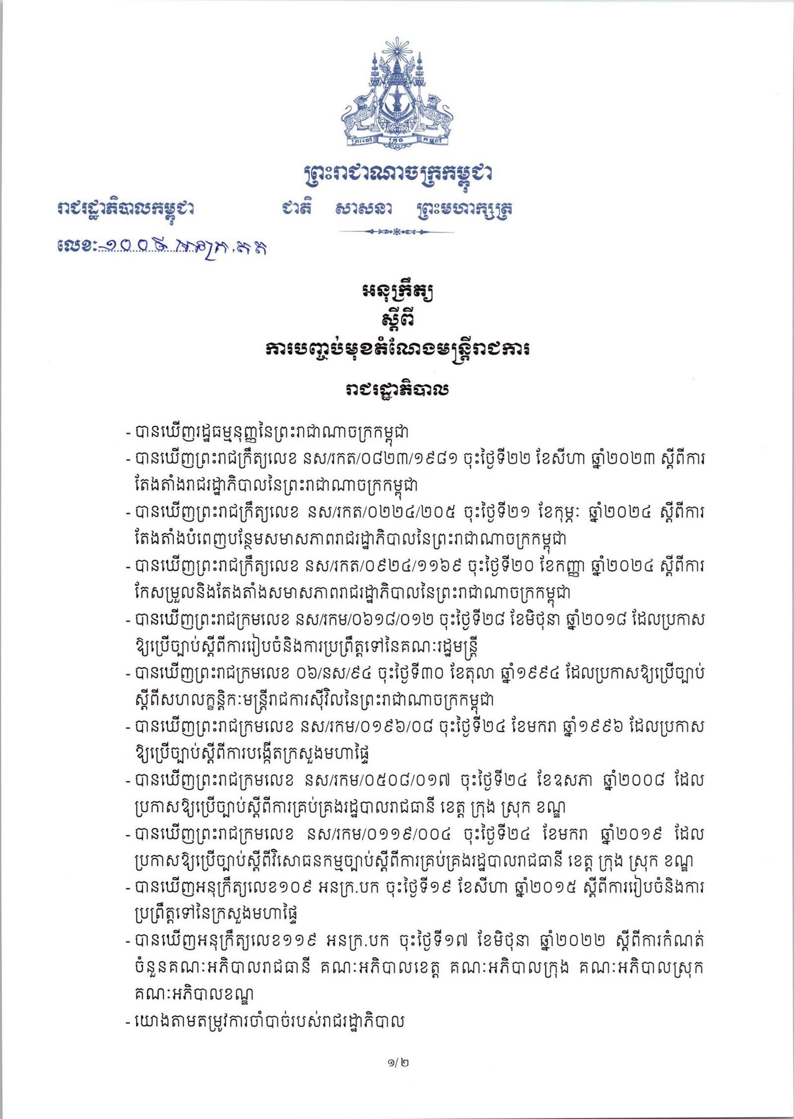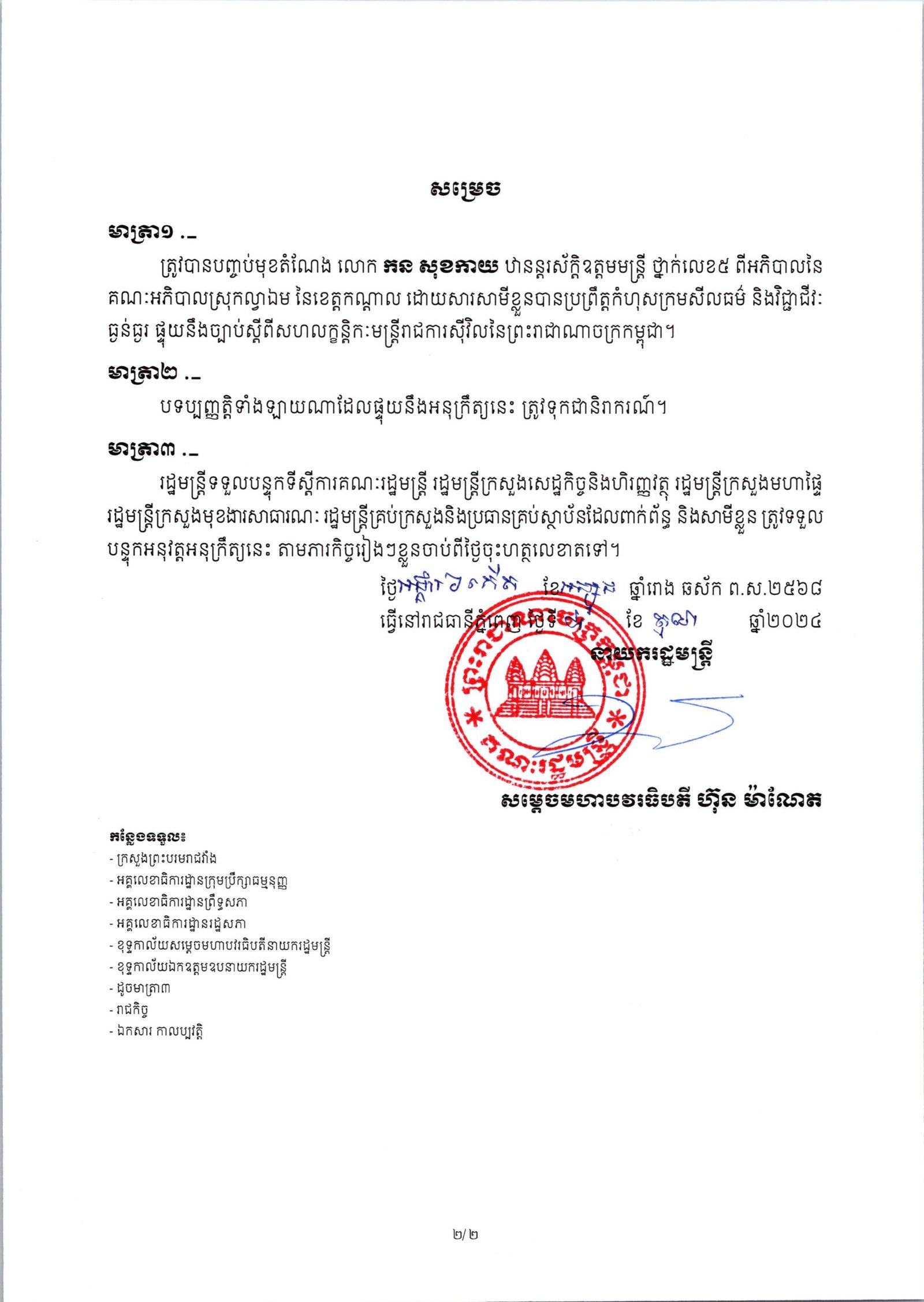 លោកនាយករដ្ឋមន្ត្រី ហ៊ុន ម៉ាណែត ចេញអនុក្រឹត្យបញ្ចប់មុខតំណែងលោក កន សុខកាយ ពីអភិបាលនៃគណៈអភិបាលស្រុកល្វាឯម នៃខេត្តកណ្តាល ដោយសារប្រព្រឹត្តកំហុសក្រមសីលធម៌ និងវិជ្ជាជីវៈធ្ងន់ធ្ងរ បន្ទាប់ពីបែកធ្លាយព័ត៌មានដែលតាមចោទថា លោកបានសូកប៉ាន់ប្រាក់ ៣០ម៉ឺនដុល្លារ ដើម្បីបានធ្វើជាអភិបាលក្រុងអរិយក្សត្រ។