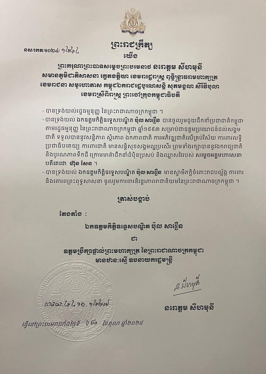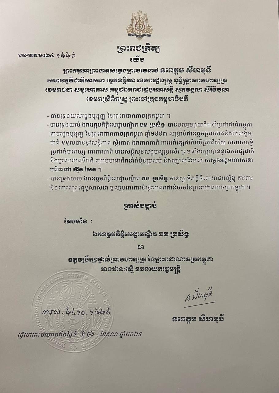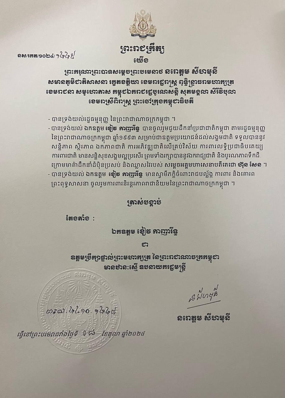 យោងតាមព្រះរាជក្រឹត្យបីដាច់ដោយឡែកពីគ្នា និងចុះកាលបរិច្ឆេទថ្ងៃទី៨ ខែតុលា ឆ្នាំ២០២៤ ដូចគ្នាបានឱ្យដឹងថា ព្រះមហាក្សត្របានត្រាស់បង្គាប់ តែងតាំងលោក ចម ប្រសិទ្ធ លោក ប៉ុល សារឿន និងលោក ខៀវ កាញារីទ្ធ ជាឧត្តមប្រឹក្សាផ្ទាល់ព្រះមហាក្សត្រ មានឋានៈស្មើ ឧបនាយករដ្ឋមន្ត្រី។
