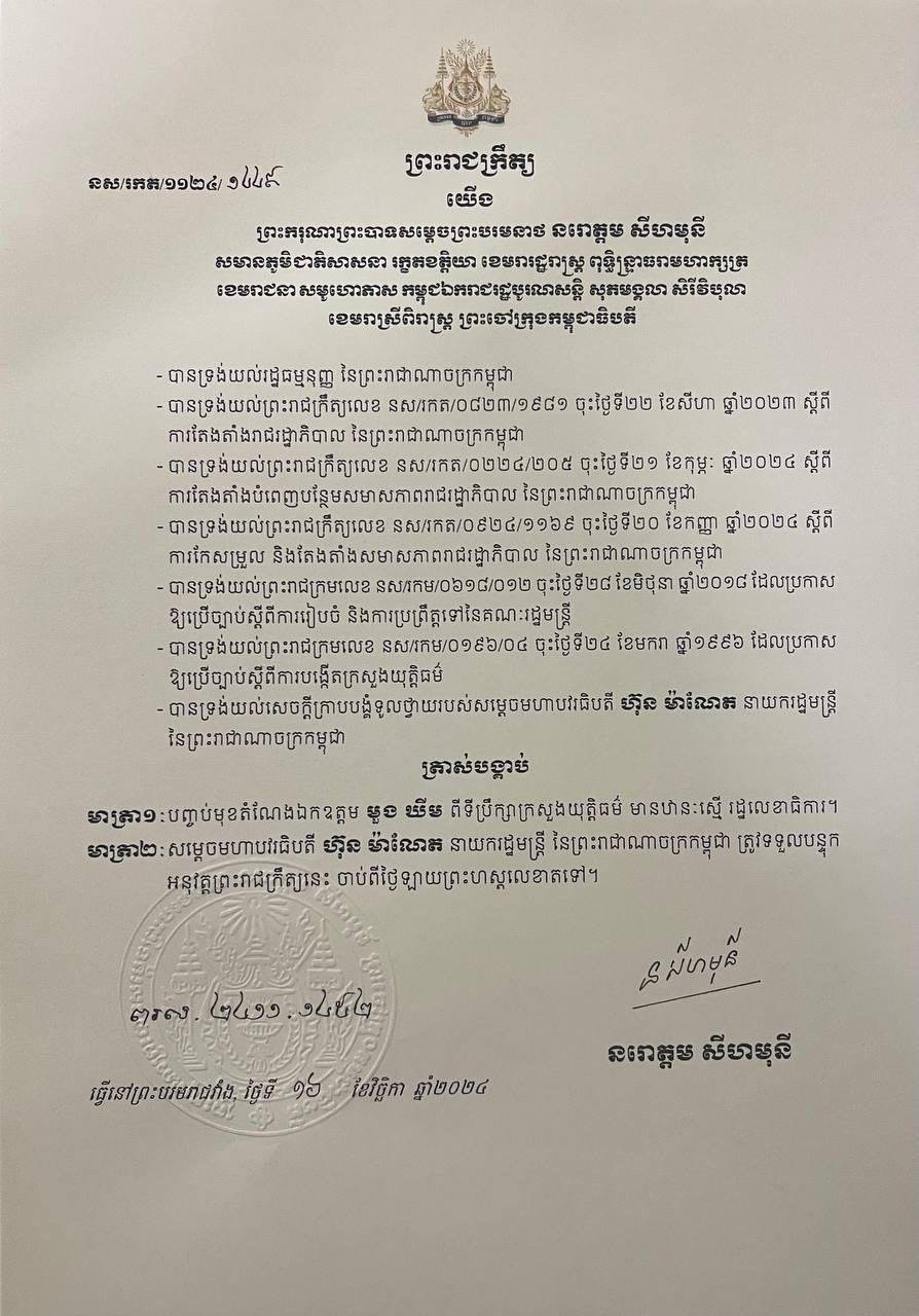 យោងតាមព្រះរាជក្រឹត្យចុះថ្ងៃទី១៦ ខែវិច្ឆិកា ឆ្នាំ២០២៤ ព្រះមហាក្សត្របានត្រាស់បង្គាប់បញ្ចប់មុខតំណែងលោក មួង ឃីម ពីទីប្រឹក្សាក្រសួងយុត្តិធម៌ មានឋានៈស្មើ រដ្ឋលេខាធិការ។ លោក មួង ឃីម ជាអតីតមន្ត្រីនគរបាលផ្កាយ៣ និងជាអនុប្រធាននាយកដ្ឋានកណ្តាលនគរបាលយុត្តិធម៌ ត្រូវបានតែងតាំងជាទីប្រឹក្សាក្រសួងយុត្តិធម៌ មានឋានៈស្មើ រដ្ឋលេខាធិការ តាមព្រះរាជក្រឹត្យចុះថ្ងៃទី១០ ខែសីហា ឆ្នាំ២០២៤។