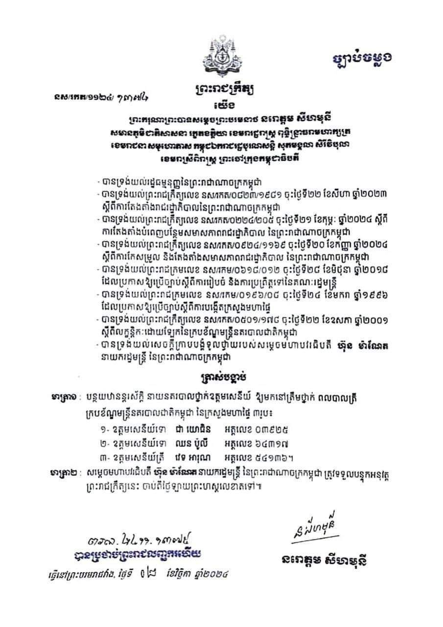 ព្រះករុណា​ ព្រះបាទ​ សម្តេច​​ព្រះ​បរមនាថ​ នរោត្តម​​ សីហ​មុនី​ ចេញ​ព្រះរាជ​ក្រឹត្យ​​ត្រាស់​​បង្គាប់​​បន្ថយ​​ឋានន្តរស័ក្តិ​​នាយ​នគរបាល​​ថ្នាក់​​ឧត្តម​​សេនីយ៍​ចំនួន​​បី​រូប​​​ឱ្យ​​មក​នៅ​​ត្រឹម​​ថ្នាក់​ពលបាល​​ត្រី​​ក្របខ័ណ្ឌ​​មន្ត្រី​នគរបាល​​ជាតិ​​កម្ពុជា​។​