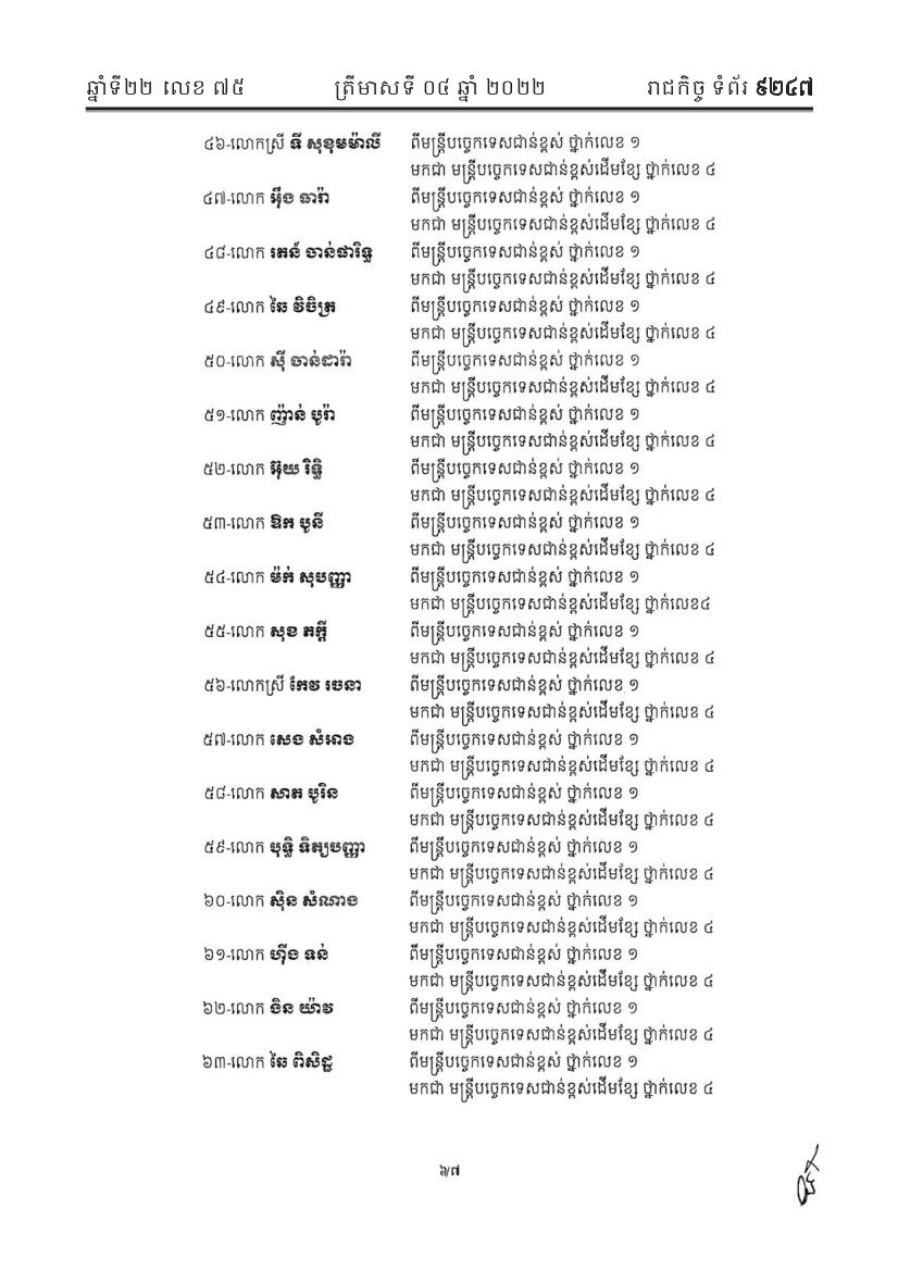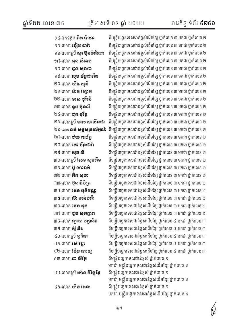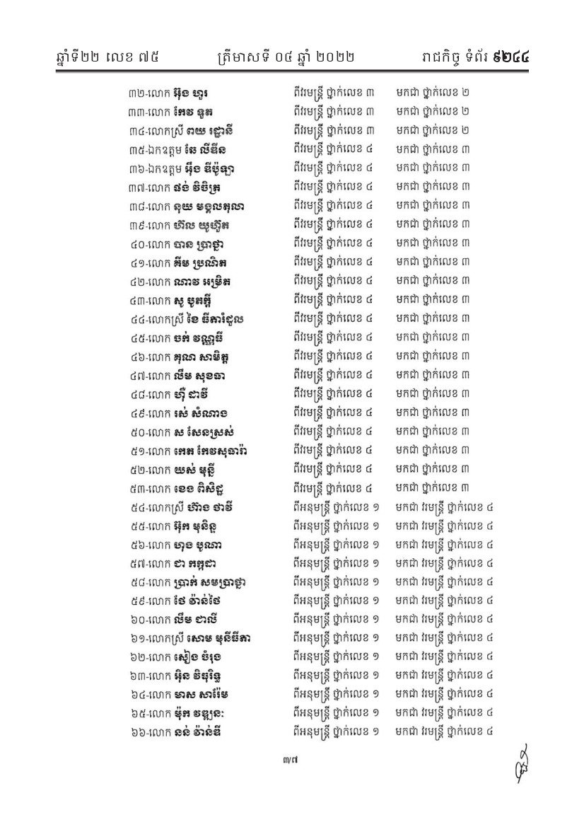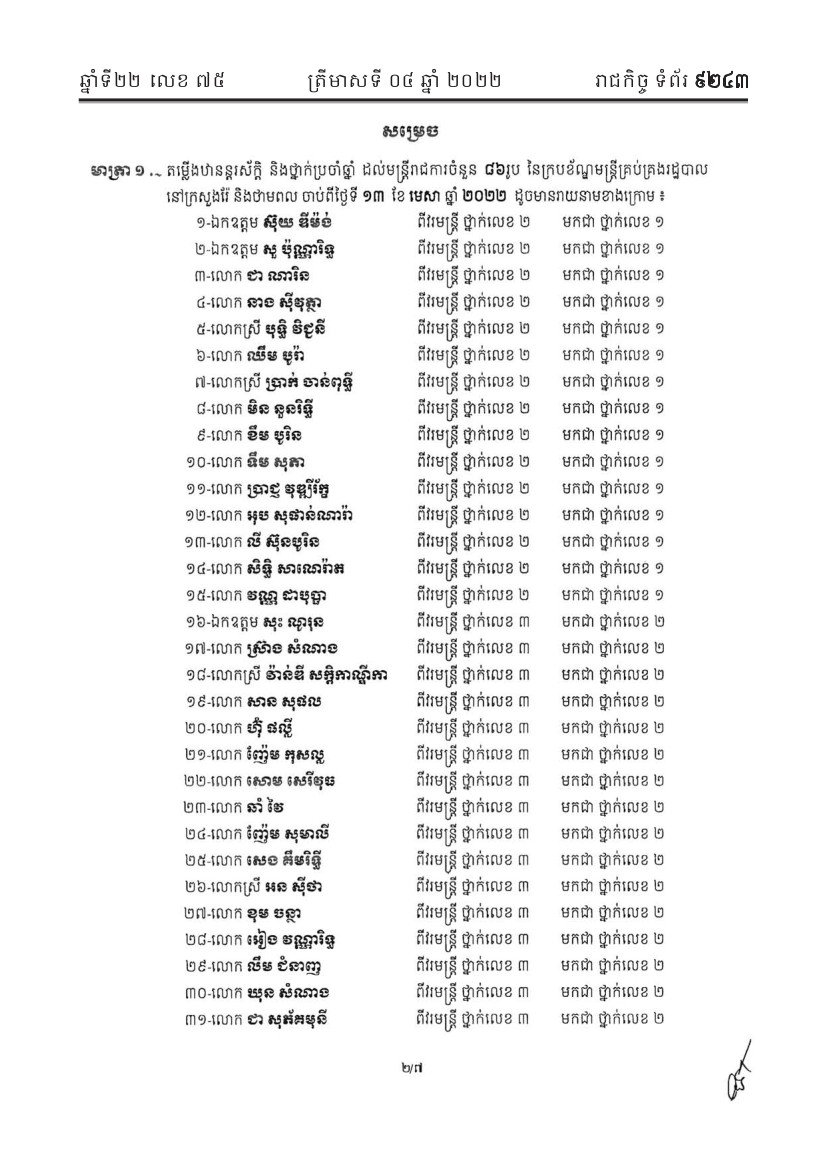 In the sub-decree, dated September 13, 2022, Prime Minister Hun Sen signed off on the promotions of 86 administrative officials and 68 senior technical officials in the Mines and Energy Ministry. The promotions were already effective as of April 13, 2022, the document says.
