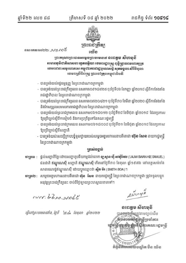 The Cambodian government issued citizenship to Indonesian national Andreyanto on October 21, 2022, and his name was changed to Anderson William. A week later on October 28, Lauw Swan Hie Samuel was given citizenship and his name changed to Smith Boa.