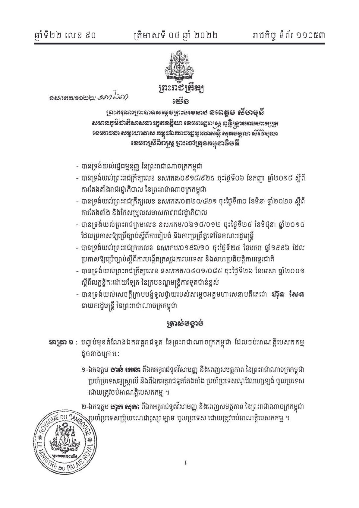 - Appointment of Heng Sarith (ហេង សារិទ្ធ) to be the ambassador of Cambodia to Indonesia, replacing Yeab Samnang (យៀប សំណាង).