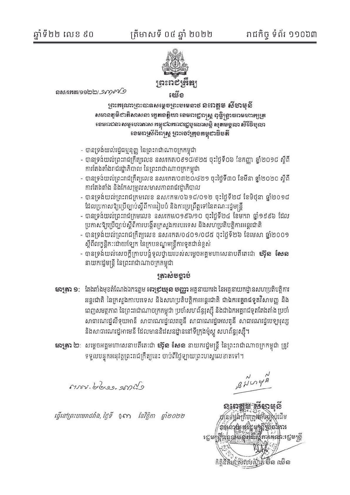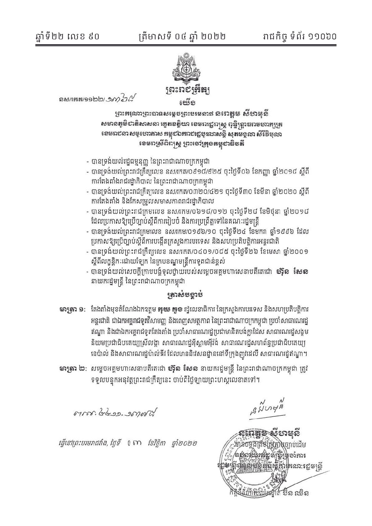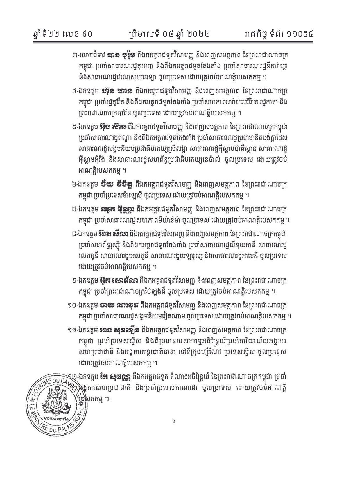 - Pichkhun Panha (ពេជ្រឃុន បញ្ញា) to be the ambassador of Cambodia to Russia, Lithuania, Latvia, Estonia, Belarus and Armenia, replacing Ath Sila (អ៊ាត សីលា).