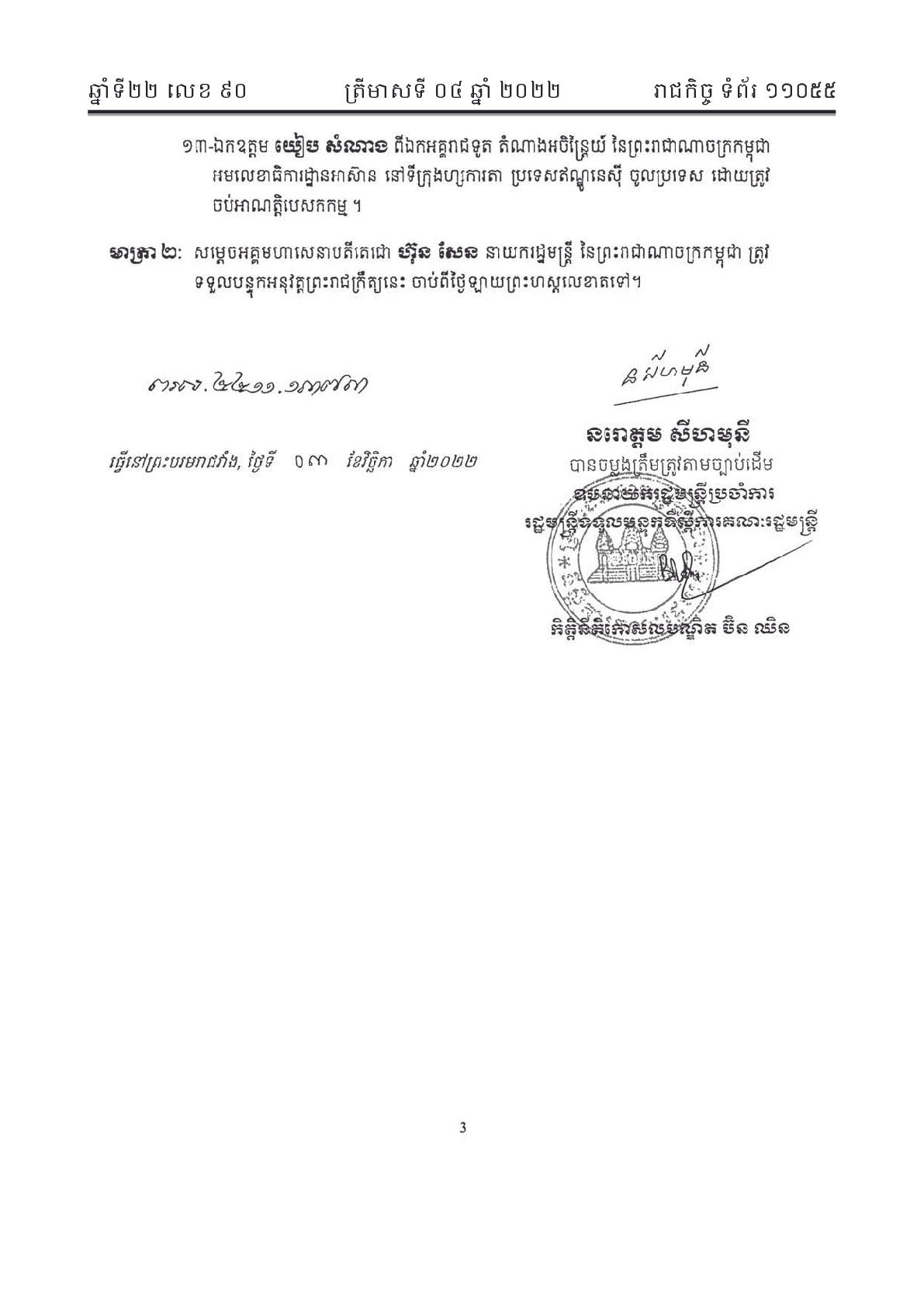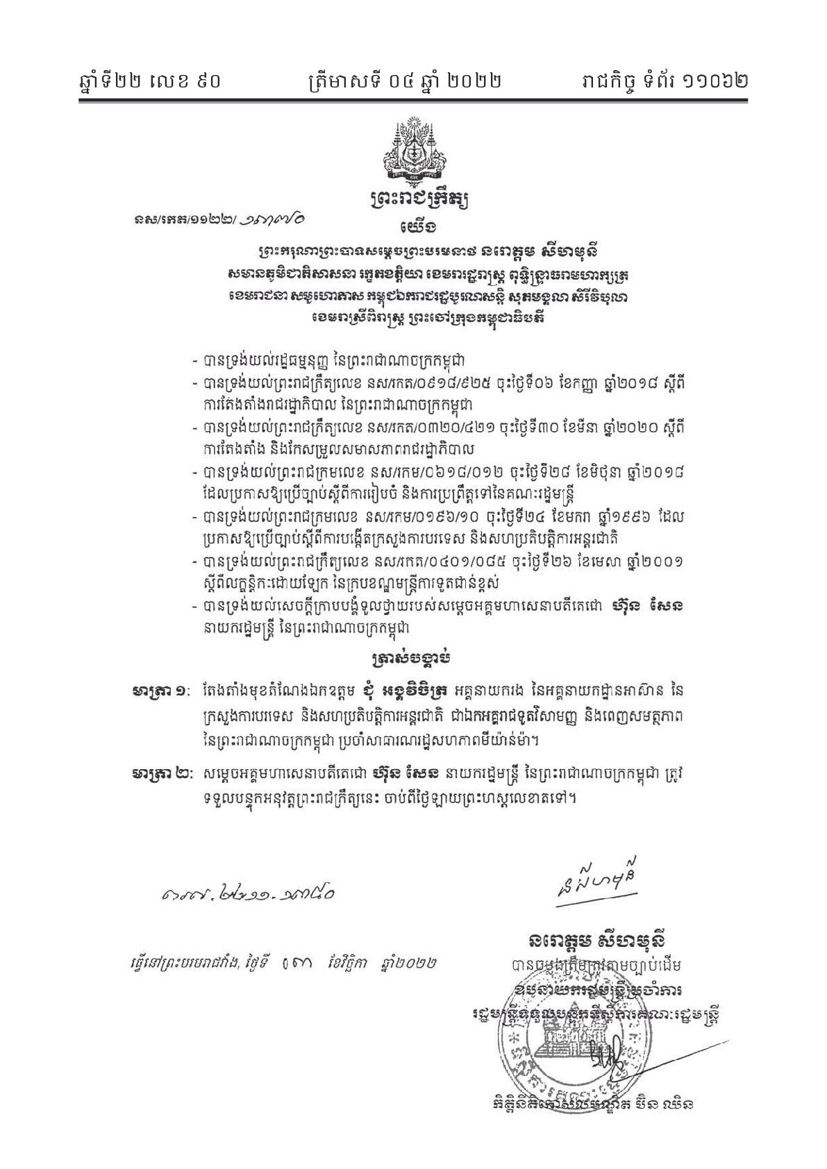 - Chea Kimtha (ជា គឹមថា) to be the ambassador of Cambodia to Vietnam, replacing Chay Navuth (ចាយ ណាវុធ).