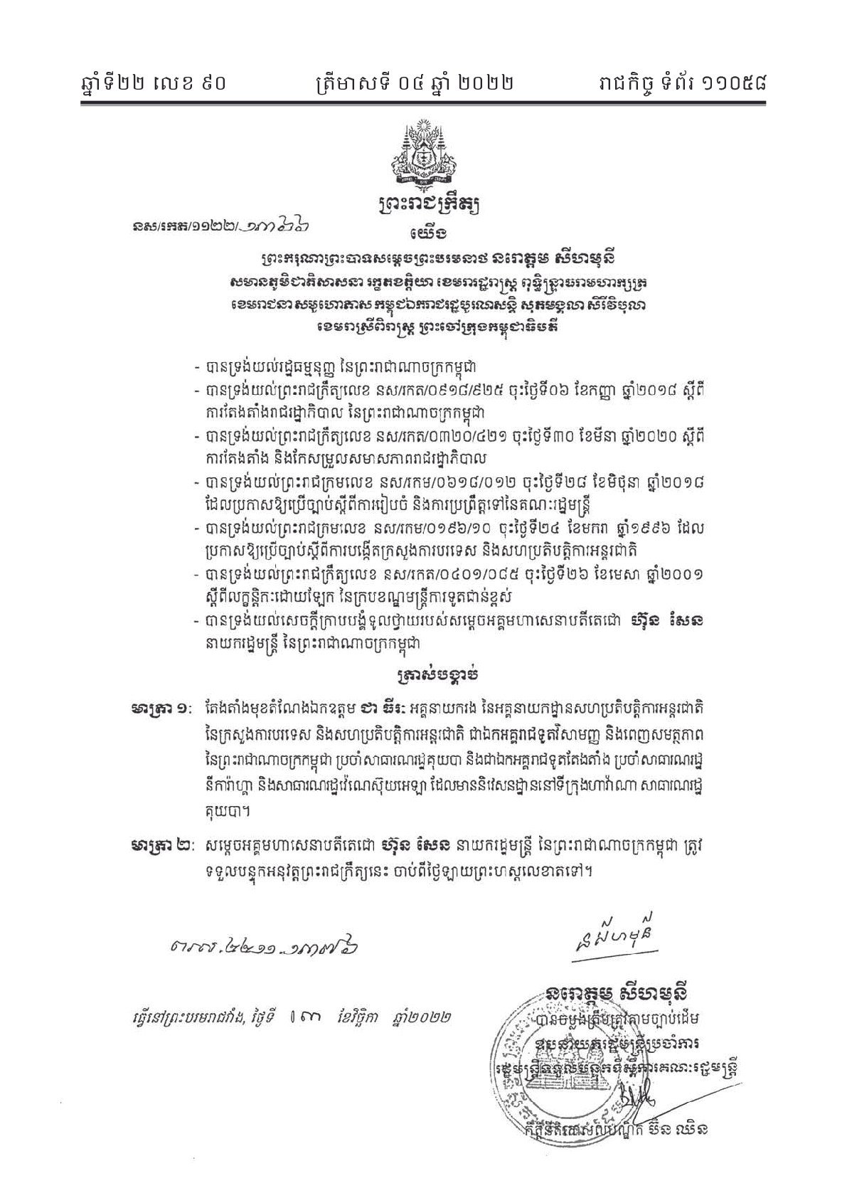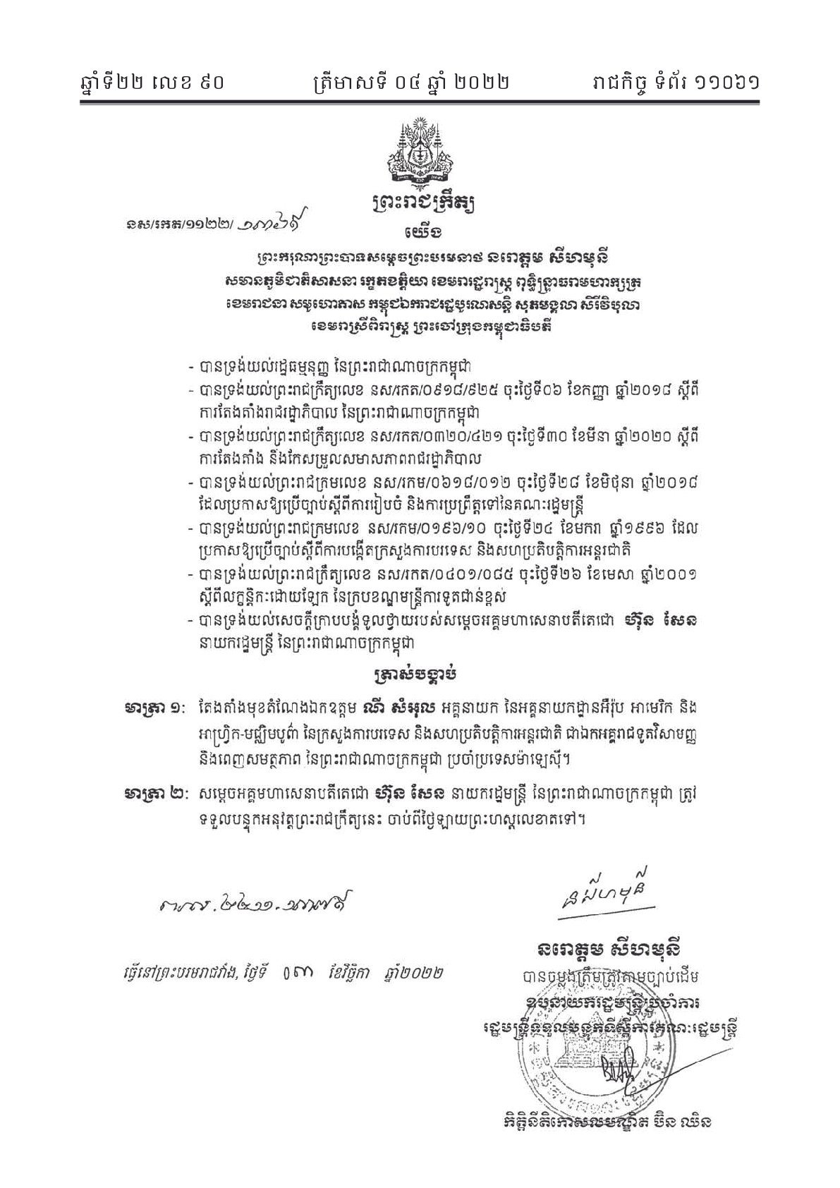 - Chea Thireak (ជា ធីរៈ) to be the ambassador of Cambodia to Cuba, Nicaragua and Venezuela, replacing Ban Borum (បាន បូរ៉ុម).
