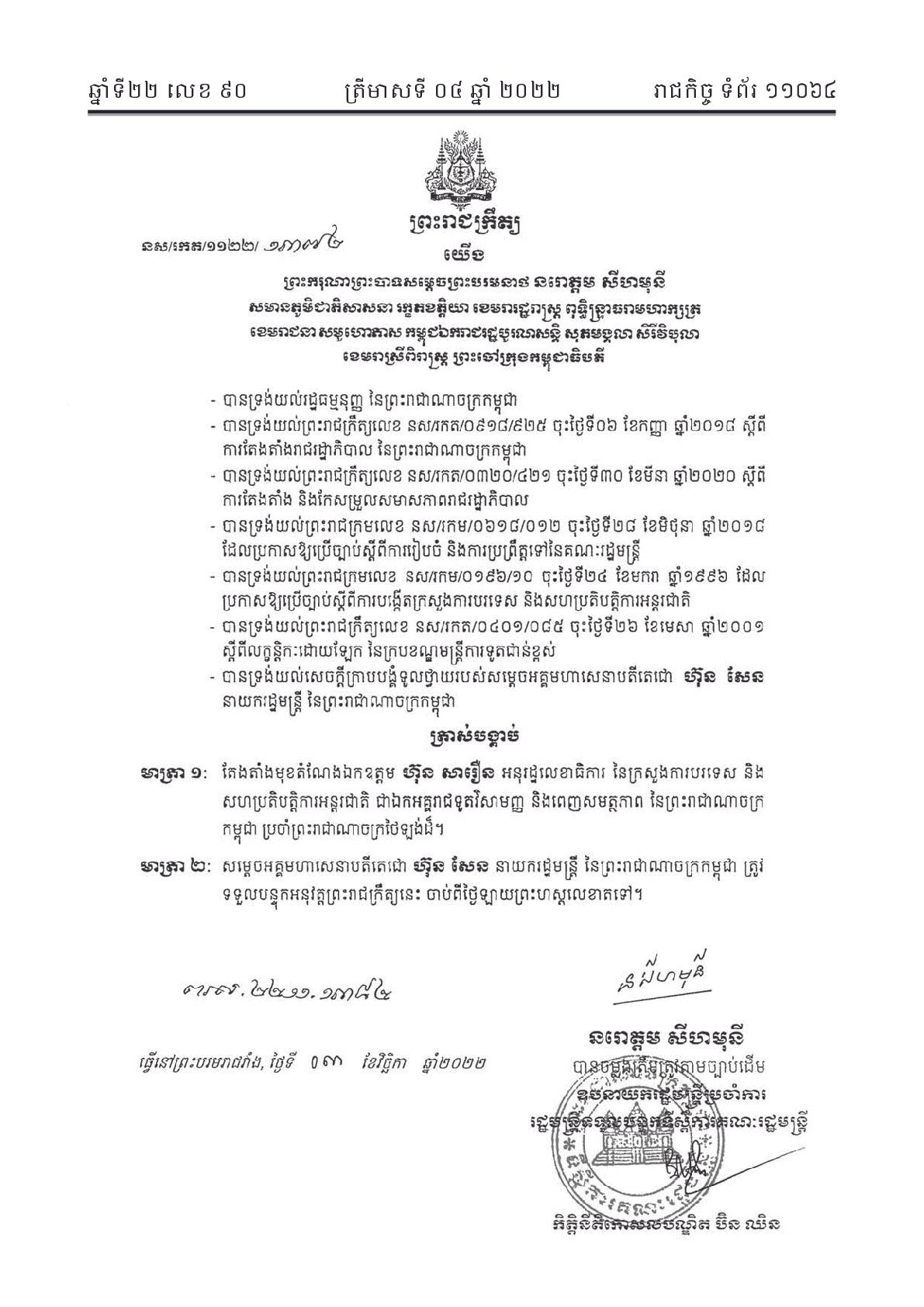- Hun Saroeun (ហ៊ុន សារឿន) to be the ambassador of Cambodia to Thailand, replacing Ouk Sophorn (អ៊ូក សោភ័ណ).