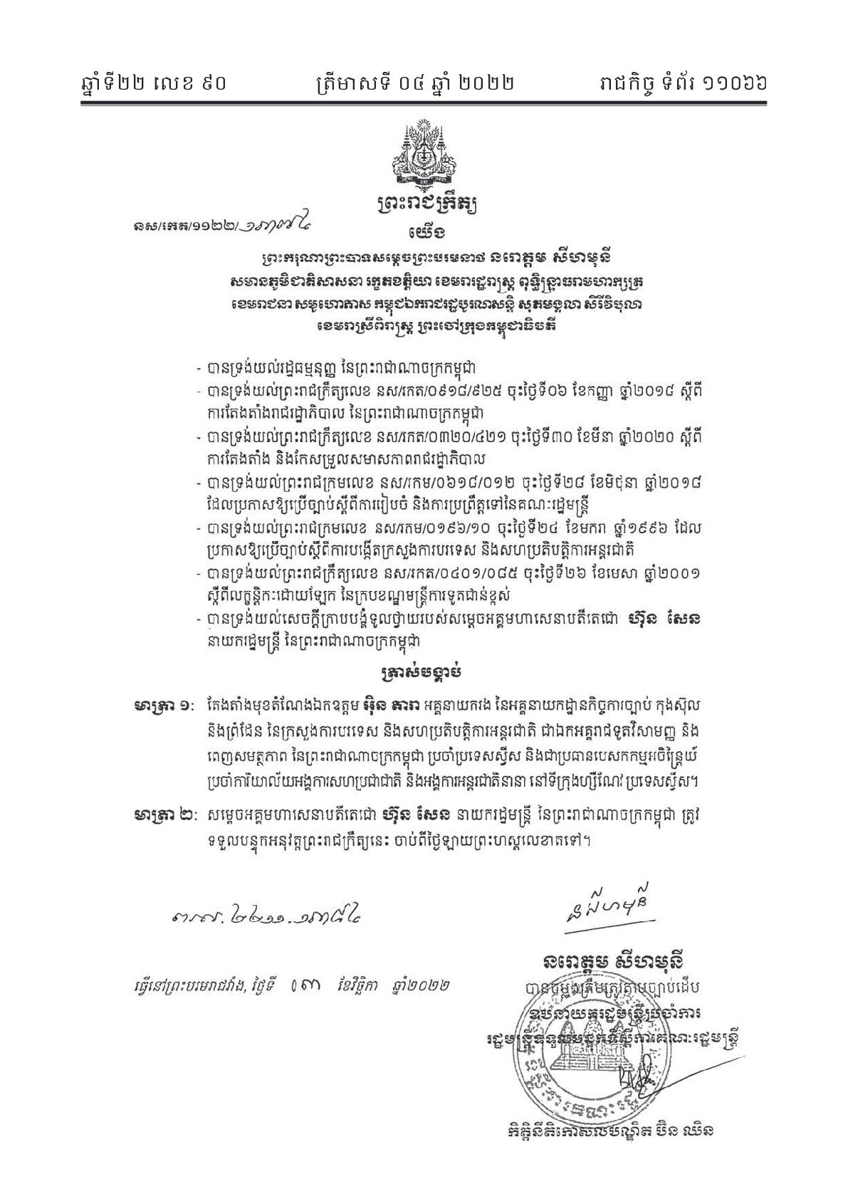 - In Dara (អ៊ិន តារា) to be the ambassador of Cambodia to Switzerland and permanent representative of Cambodia to the United Nations and international organizations in Geneva, Switzerland, replacing An Sokkhoeurn (អាន សុខខឿន).