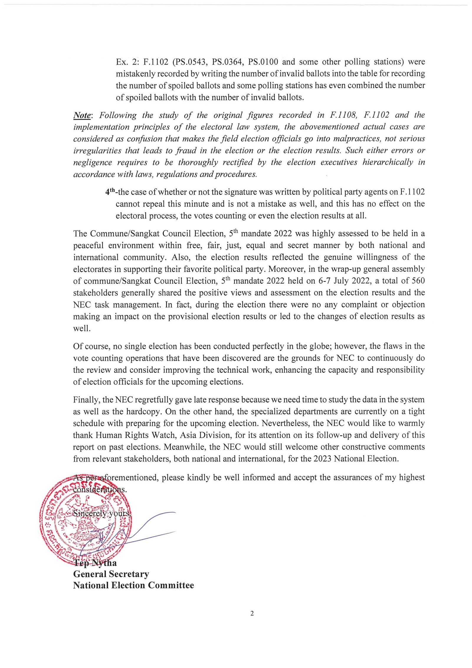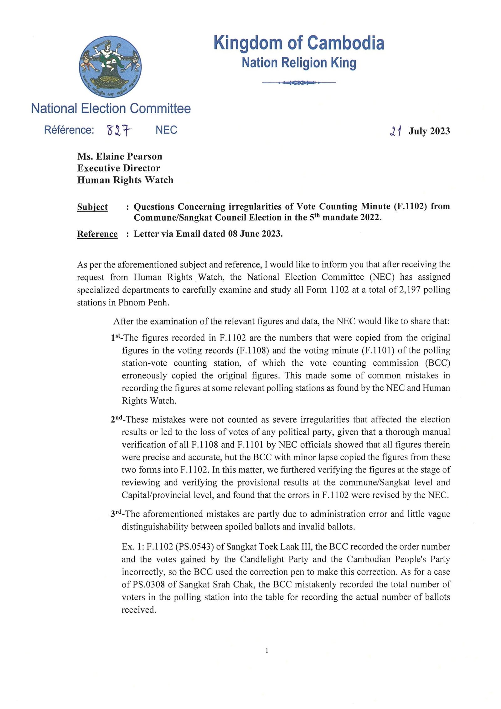 The NEC statement was released on government-friendly Fresh News on the last day of campaigning and was in response to a report released by Human Rights Watch in June, which alleged counting irregularities in Phnom Penh. The U.S.-based rights group had reviewed 1102 forms from all polling stations in Phnom Penh and found errors with vote tallies, the use of white ink to amend information and faults with observer signatures on documents.