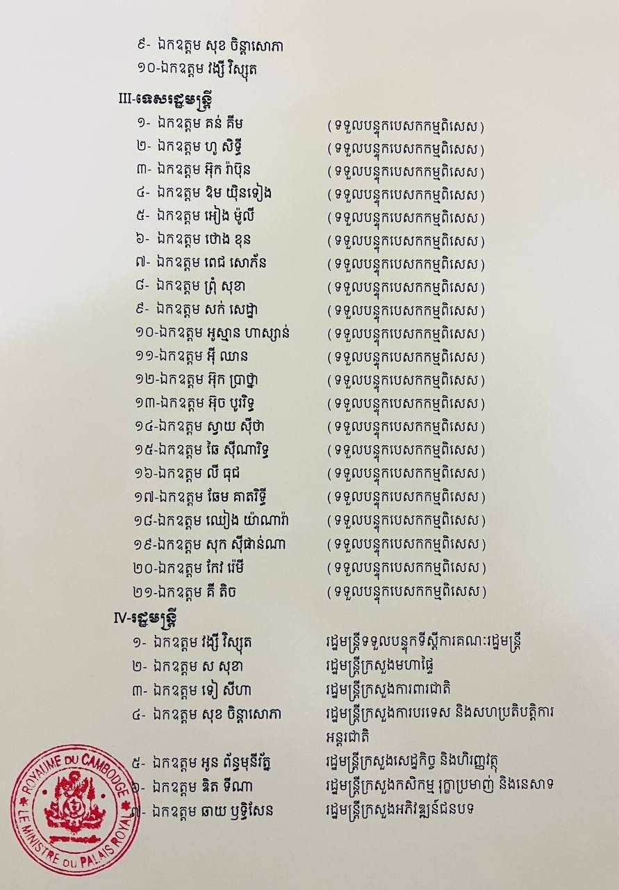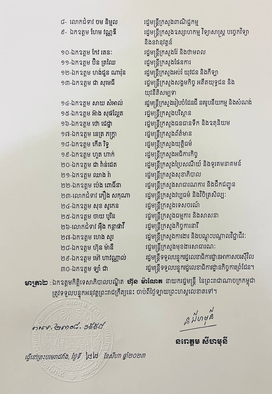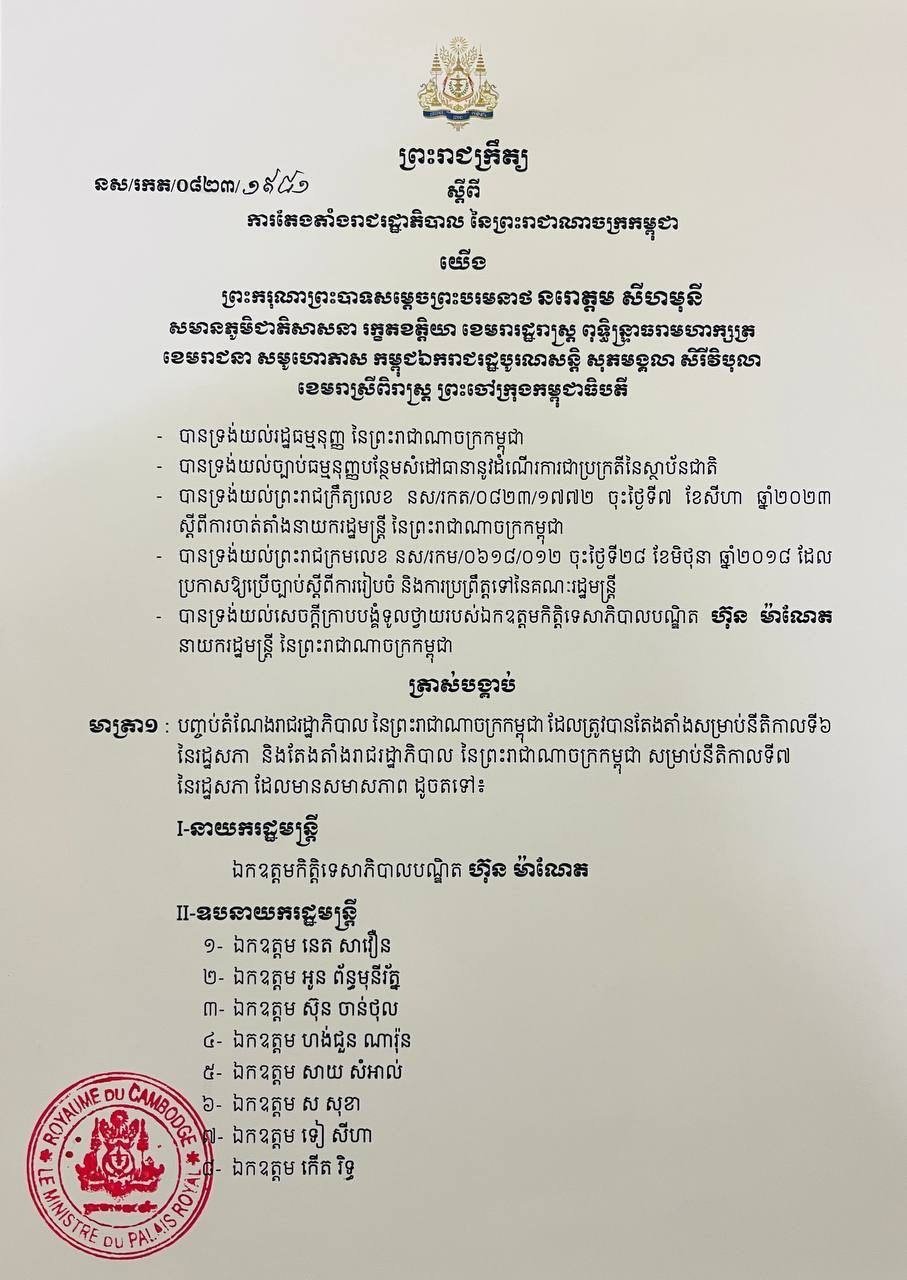 King Norodom Sihamoni has signed royal decrees appointing the new Council of Ministers in Prime Minister Hun Manet’s new government. The documents were published on Hun Sen’s Telegram account, and confirms previously reported lists.