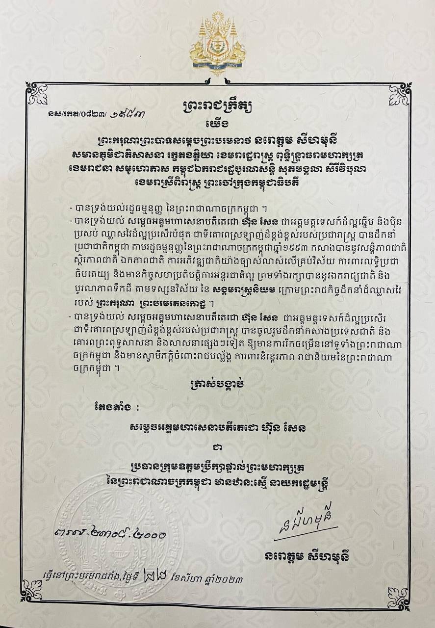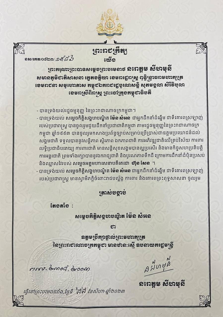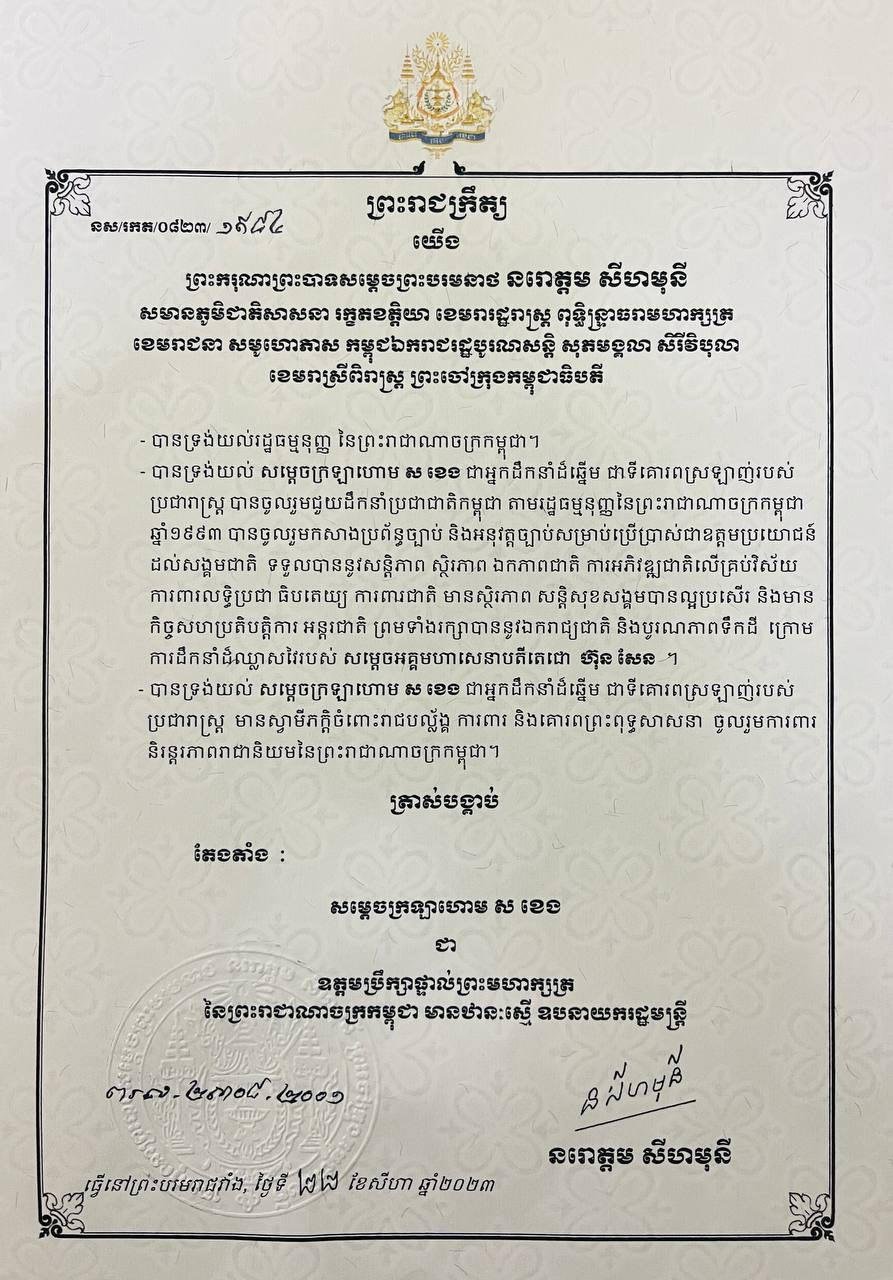 King Norodom Sihamoni has signed royal decrees appointing the new Council of Ministers in Prime Minister Hun Manet’s new government. The documents were published on Hun Sen’s Telegram account, and confirms previously reported lists.